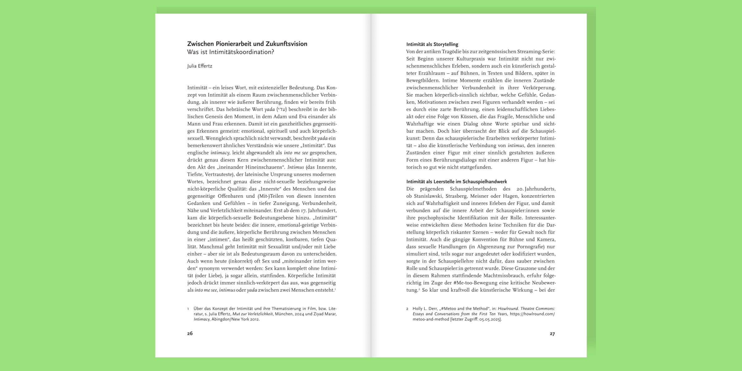 Mit der Intimitätskoordination hat sich in den vergangenen Jahren ein neuer Beruf entwickelt, dessen Ziel es ist, Film- und Bühnenproduktionen bei der Inszenierung intimer Szenen zu unterstützen und die übereinstimmende Zusammenarbeit aller Beteiligten zu gewährleisten. Dabei ist die Mitarbeit an der künstlerischen Vision der Produktionen fester Bestandteil des Berufsbildes. Während auf den Sets in den USA und Großbritannien längst mit Intimitätskoordinator: innen gearbeitet wird, steckt ihre Integration hierzulande jedoch in den Anfängen. Dieser Ratgeber beleuchtet erstmals die Entwicklung des Berufes im deutschsprachigen Raum und zeigt seine Vorteile auf. Er führt in die Grundlagen und Methoden der Intimitätskoordination ein und beantwortet zentrale Fragen: Wann und warum sollte mit Intimitätskoordinator: innen gearbeitet werden? Wie gestaltet sich die Arbeitsweise? Welche Methoden und Techniken kommen in der Praxis zum Einsatz? Mit welchen Gewerken wird wie zusammengearbeitet? Welche Unterschiede bestehen zwischen Film und Bühne? Wie ist die Ausbildung von Intimitätskoordinator: innen organisiert?