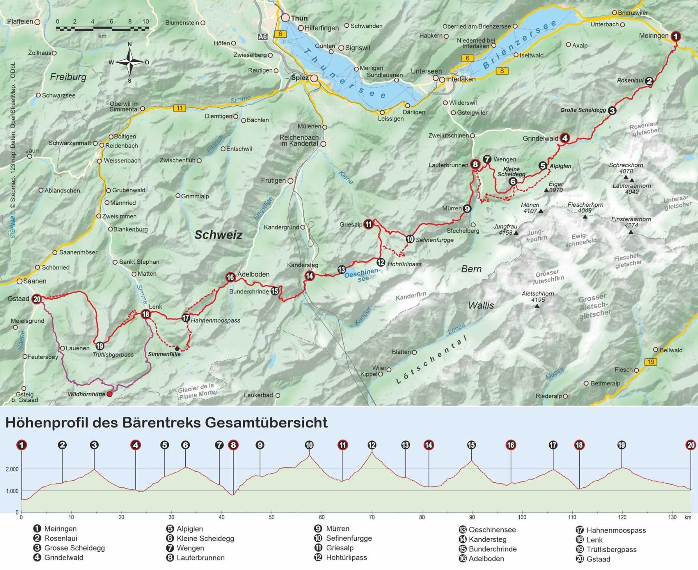 Im Berner Oberland drängt sich auf engstem Raum eine der berühmtesten Bergwelten zusammen, darunter das viel bestaunte Gipfeltrio von Eiger, Mönch & Jungfrau. Allein im östlichen Teil der Berner Alpen recken 8 der insgesamt 47 Schweizer Viertausender ihre vergletscherten Gipfel majestätisch in den Himmel und prägen das Landschaftsbild in einmaliger Weise. Das Berner Oberland ist vor allem auch ein Land der Wasserfälle, Bergseen und dramatischen Schluchten: die Simmenfälle, Staub- und Trümmelbach, die Giessbachfälle, die Aare- und die Rosenlauischlucht, der Oeschinen- und der Blausee. Mit zu den glanzvollsten Weitwanderungen zählt der Bärentrek, der das Berner Oberland in 7 Tagen (134 km) von Ost nach West durchquert und die spektakulärsten Landstriche erfasst. Im Banne gigantischer Gletscher und imposanter Felswände folgt die Route den Spuren der Bären, die einst in grauer Vorzeit die Pässe überquerten. Neben der einmaligen Hochgebirgslandschaft, Fauna und Flora sorgen malerische Täler mit hübschen Dörfern, die weltberühmte Namen tragen, wie Grindelwald, Lauterbrunnen, Kandersteg und Lenk, für weitere Abwechslung, Komfort und Nostalgie aus der Jahrhundertwende. Und wer zünftiges Hüttenleben vorzieht, findet an ausgesuchten Stellen rustikale Bergunterkünfte. Ausgangspunkt ist Meiringen im Haslital, Endpunkt Gsteig im Saanenland. Dank des vorbildlichen öffentlichen Verkehrsnetzes kann man die Tour auch in kürzeren Etappen gestalten oder in Wochenendtrips aufteilen.