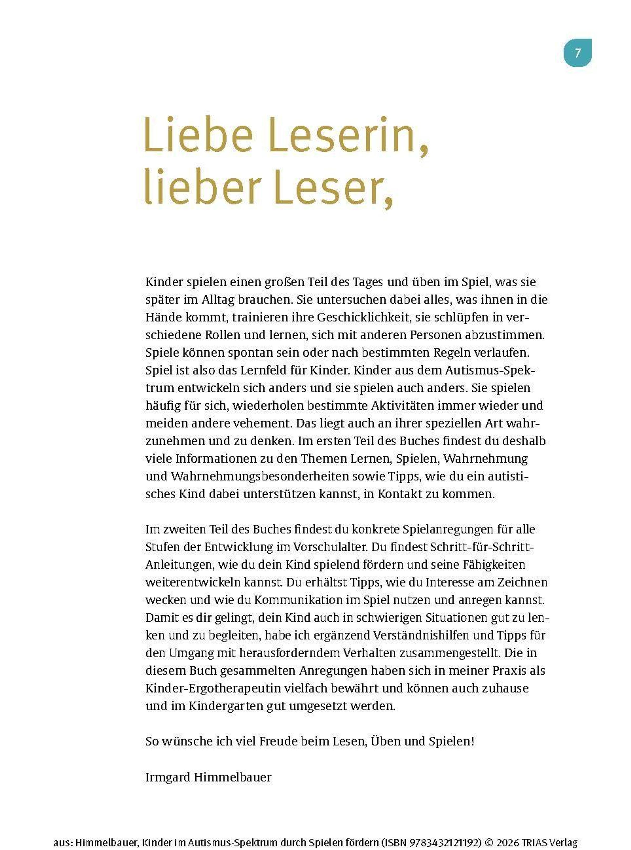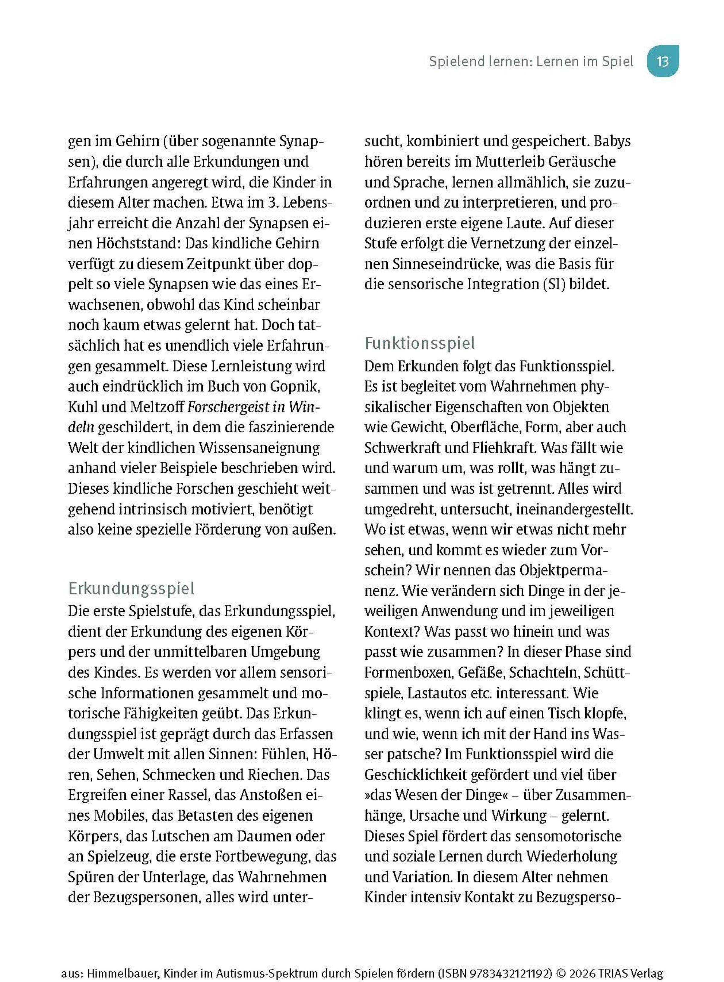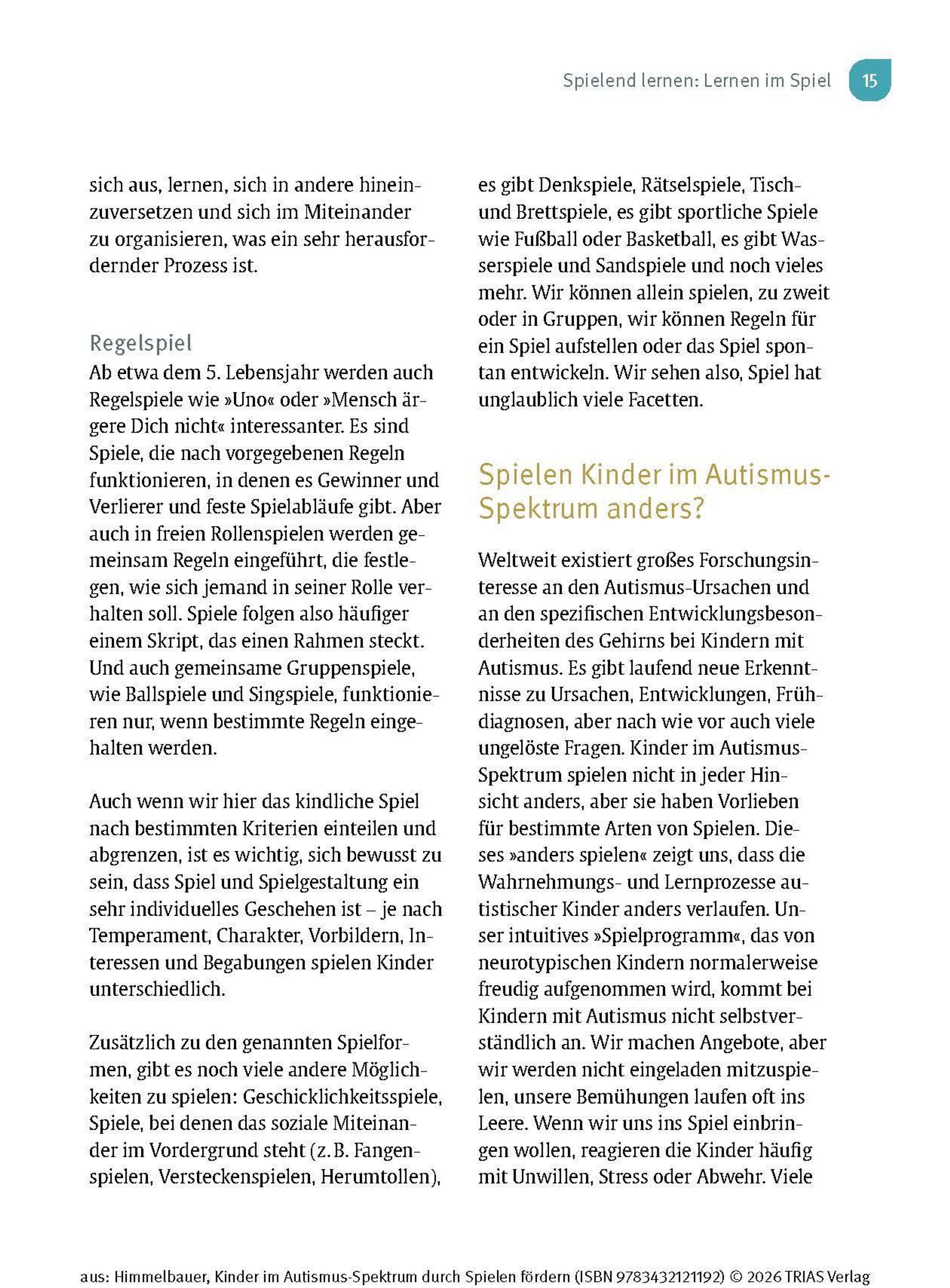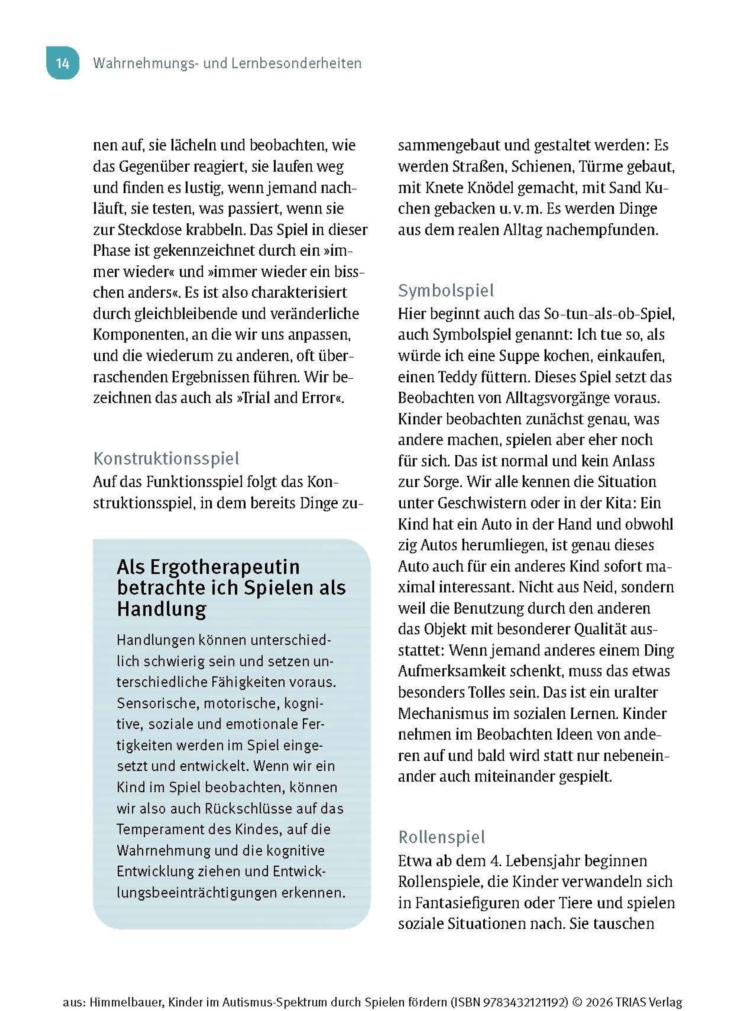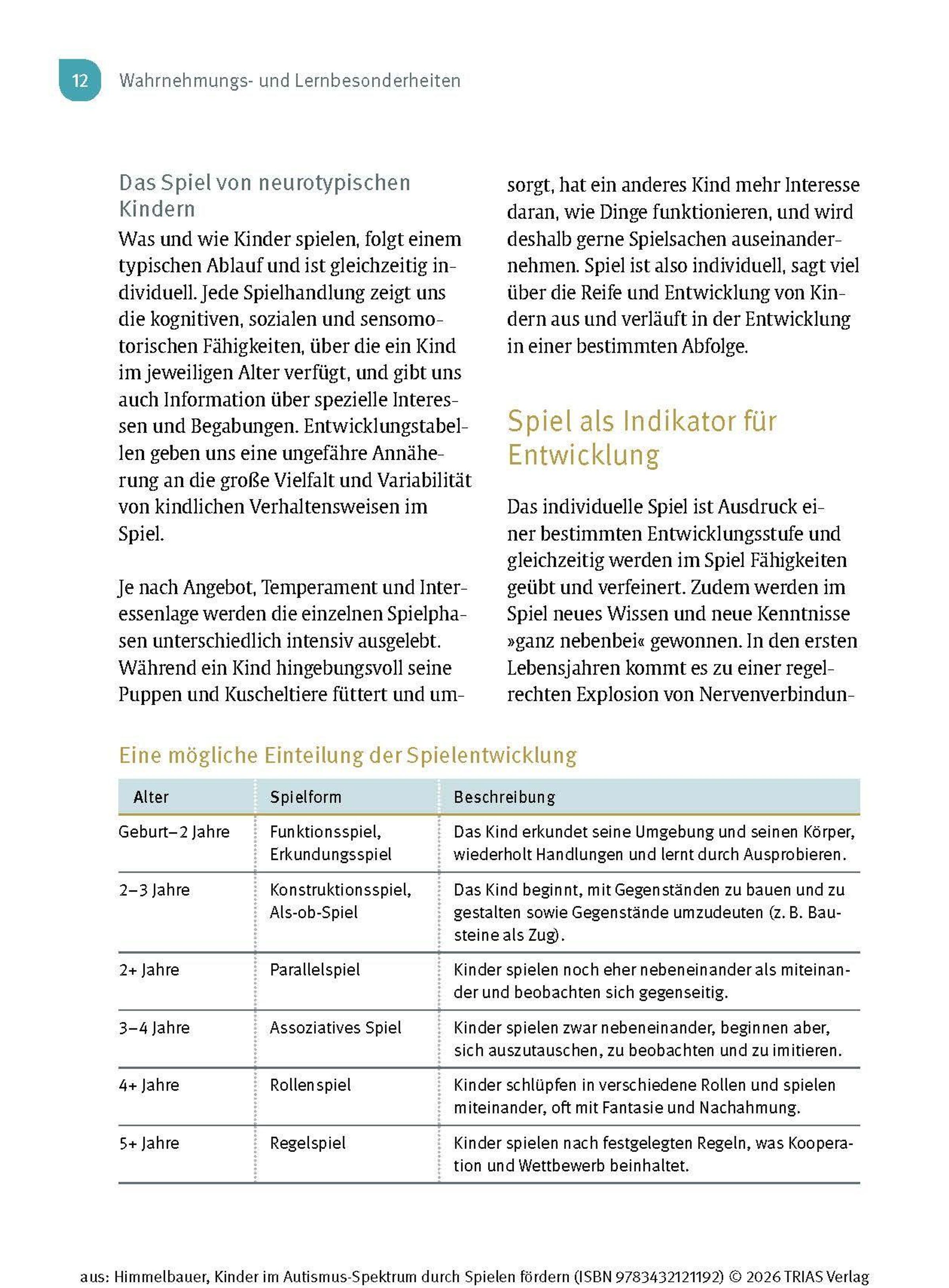 Wenn Dein Kind die Diagnose "Autismus-Spektrum-Störung" (ASS) erhält oder Du Kinder aus dem Spektrum als Therapeutin oder Pädagogin begleitest, stellst Du Dir bestimmt die Frage: Wie kann ich das Kind unterstützen, damit es sich gut entwickeln kann? Kinder im Autismus-Spektrum zeigen Auffälligkeiten in vielen Entwicklungsbereichen und auch in ihrem Spielverhalten. Sie spielen gerne für sich und haben Vorlieben für bestimmte Abläufe und Aktivitäten, die sie kaum variieren. Im Kleinkind- bzw. Kindergartenalter ist Spielen der Schlüssel zum Lernen. Ergotherapeutin Irmgard Himmelbauer zeigt Dir in diesem Buch, wie Du mit einfachen Spielen das Kind Schritt für Schritt fördern kannst.