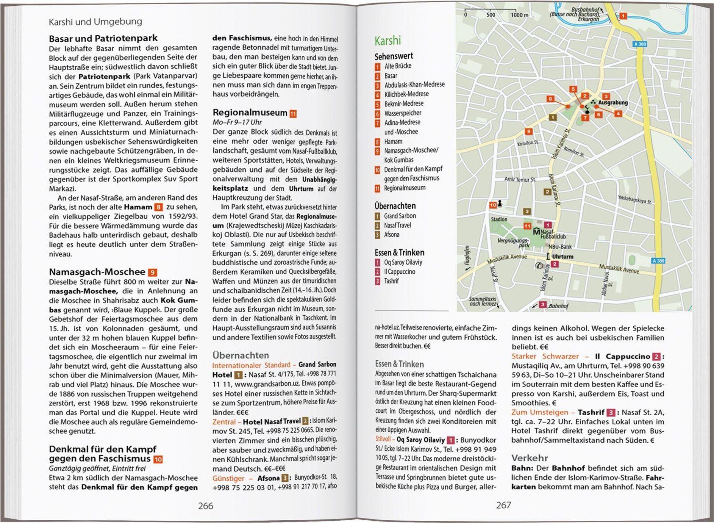 Usbekistan bietet Reisenden eine eigenwillige Mischung aus osteuropäischem Plattenbau-Charme und dem orientalischen Zauber aus Tausendundeiner Nacht. Altehrwürdige Orte wie Buchara und Chiwa locken mit Museen, Architekturhighlights und gut erhaltenen Altstädten. Im weniger bekannten Hinterland finden Neugierige und Abenteurer weite Steppenlandschaften, heißen Wüstensand, schneebedeckte Gipfel und fruchtbare Täler. Das DUMONT Reise-Handbuch führt Sie zu den sehenswertesten Ecken des Landes und sorgt mit aktuellen Infos und übersichtlichen Karten für Orientierung.