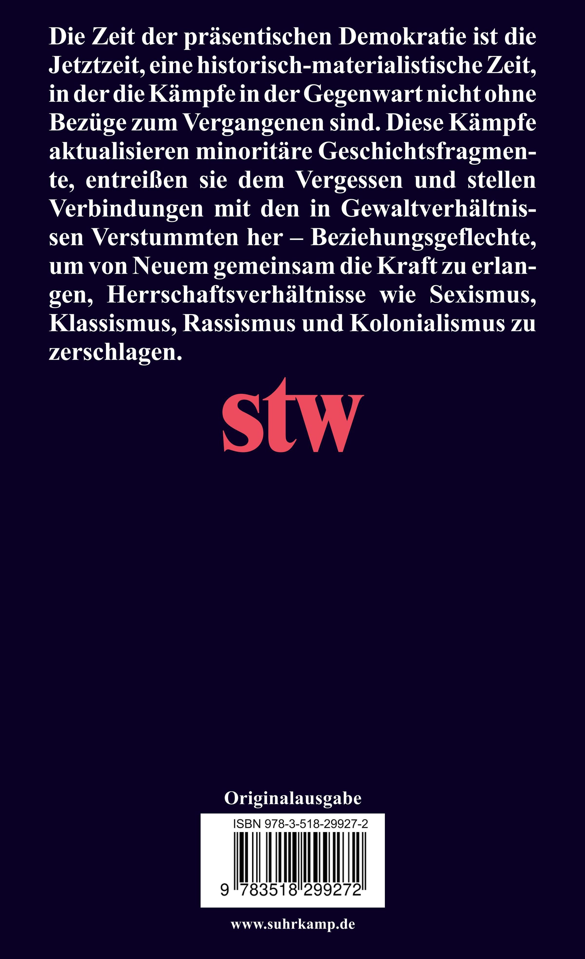 Inmitten der Krisen und Bedrohungen der liberalen Demokratie entwickelt Isabell Lorey eine Demokratie im Präsens, die politische Gewissheiten ebenso aufbricht wie lineare Vorstellungen von Fortschritt und Wachstum. Mit ihrer queer / feministischen politischen Theorie formuliert sie eine grundlegende Kritik an maskulinistischen Konzepten von Volk, Repräsentation, Institution und Multitude. Und sie entfaltet einen originellen Begriff von präsentischer Demokratie, der auf Sorge und Verbundenheit, auf der Unhintergehbarkeit von Verantwortlichkeiten beruht - und ohne vergangene Kämpfe und aktuelle Praktiken sozialer Bewegungen nicht zu denken ist.