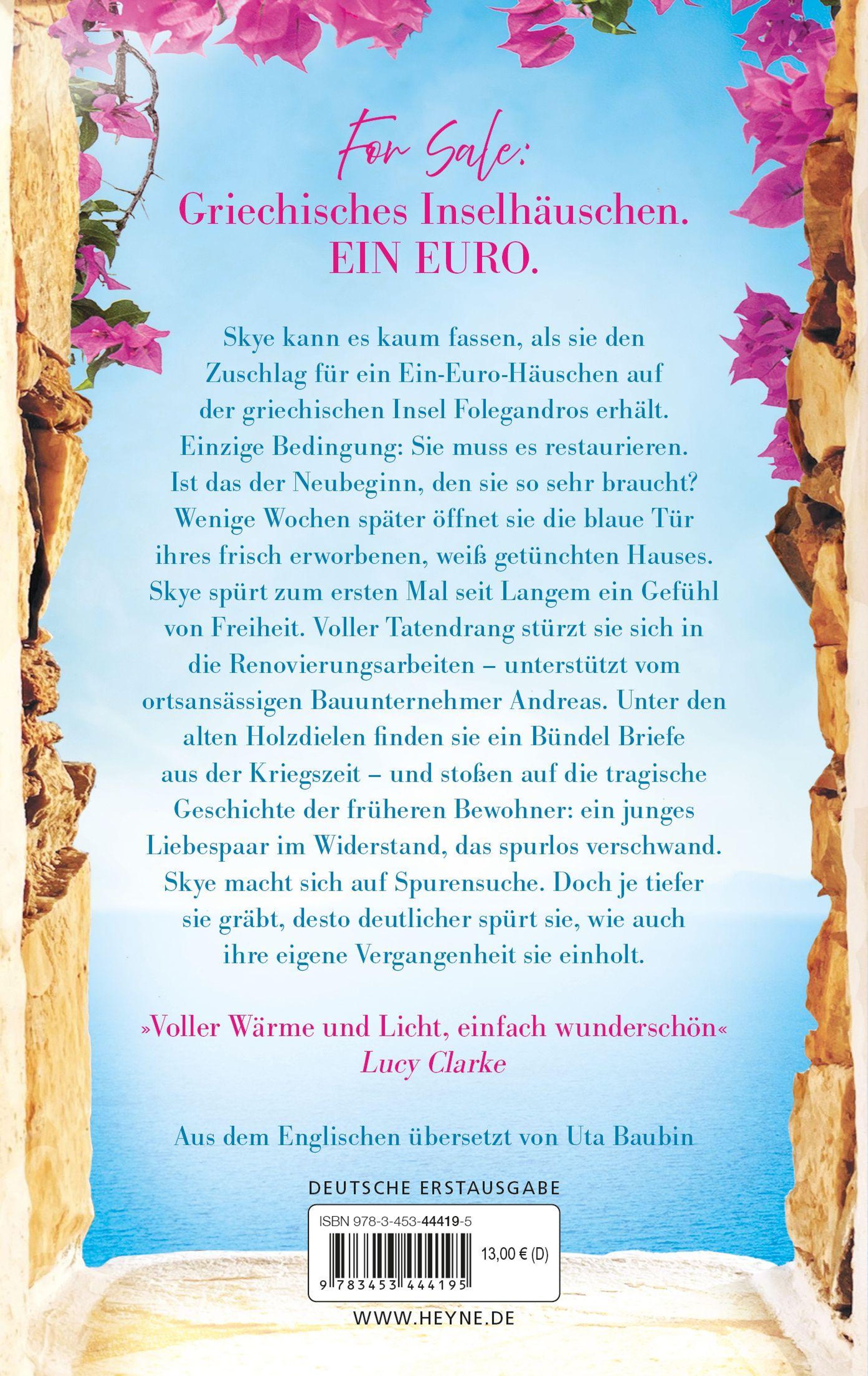 Skye fällt aus allen Wolken, als sie den Zuschlag für ein Ein-Euro-Häusschen auf der griechischen Insel Folegandros erhält. Einzige Bedingung: Sie muss es wieder herrichten. Könnte das die Alternative zu ihrem anstrengenden Leben sein, von der sie träumt? Wenige Wochen später schließt sie die zerschlissene blaue Tür ihres weiß getünchten neuen Zuhauses auf. Dass Meer in der Bucht vor ihren Fenstern glitzert, und sie fühlt sich endlich frei. Voller Elan startet Sky die Renovierung, zum Glück hilft ihr der ansässige Bauunternehmer Andreas. Unter den Dielen stoßen die beiden auf alte Briefe aus der Kriegszeit - und auf das dramatische Schicksal der vorigen Besitzer. Ein junges Liebespaar im Widerstand, das spurlos verschwand. Skye ist entschlossen, die Wahrheit herauszufinden. Doch auch ihre eigene Vergangenheit droht sie einzuholen.