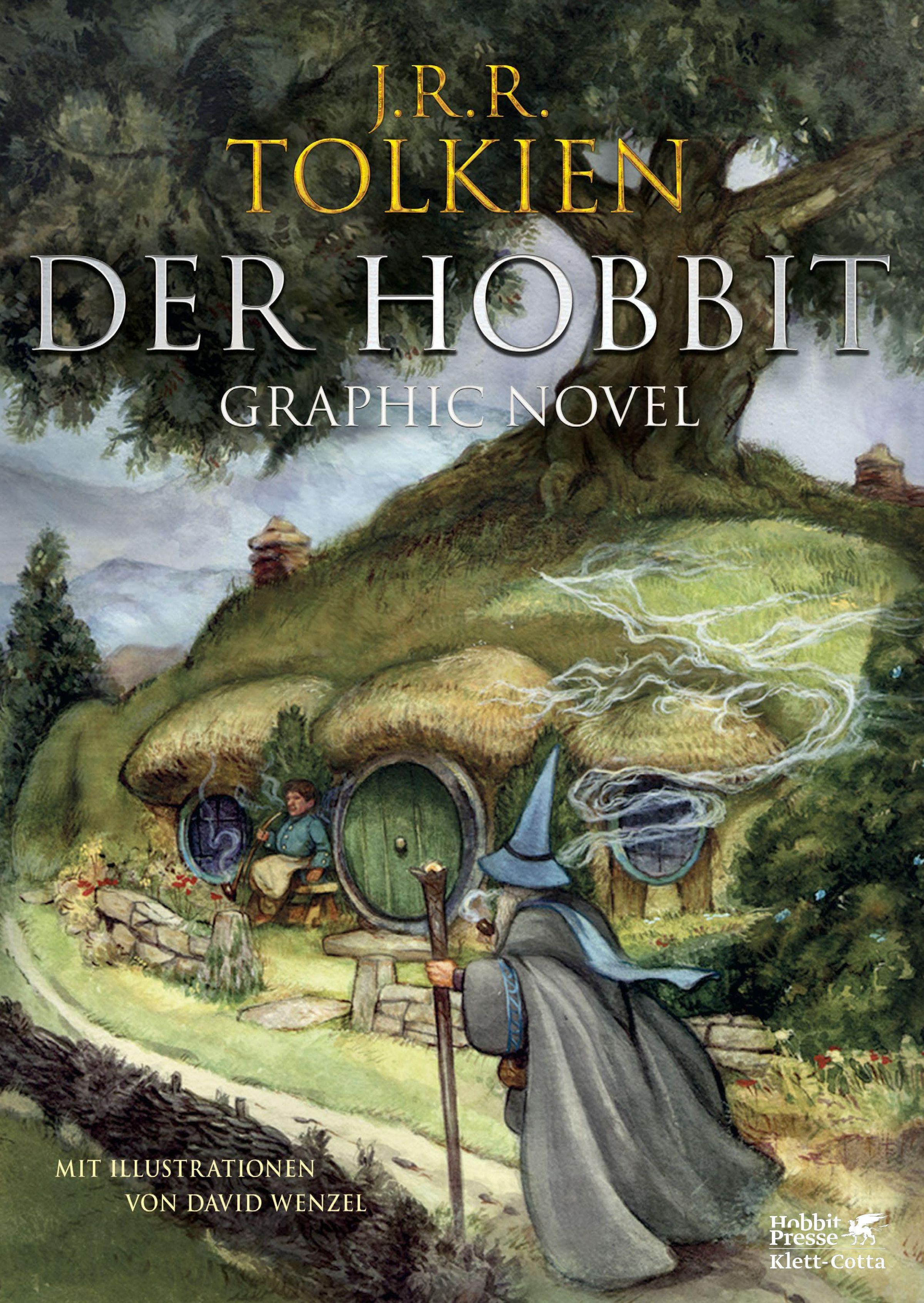 "J.R.R. Tolkien, Der Hobbit, Graphic Novel. Mit Illustrationen von David Wenzel." Ein Zauberer nähert sich einem Hobbit-Haus., Buch