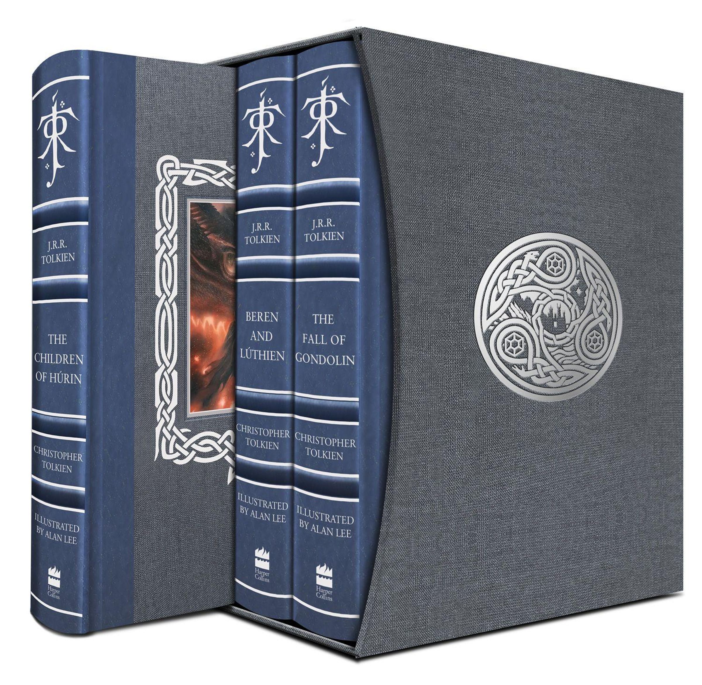 This deluxe set of these beautifully illustrated works features brand-new cover designs by the artist. Each volume is quarter-bound and has additionally been enhanced for the first time with sprayed edges. They are housed in a custom-built cloth slipcase stamped in silver foil with motifs and a hidden artwork created exclusively by Alan Lee, and accompanied by three removable art cards plus two foldout maps of Beleriand drawn by Christopher Tolkien.
