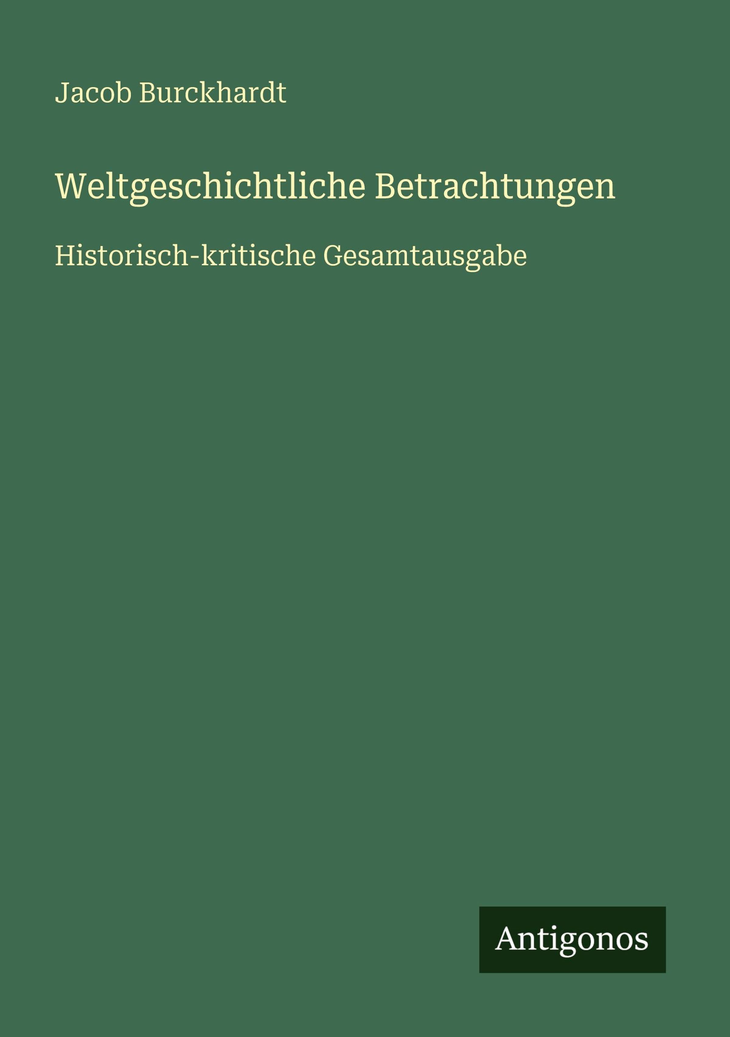 Jacob Burckhardt, Weltgeschichtliche Betrachtungen, Historisch-kritische Gesamtausgabe. Grüner Hintergrund, Antigonos-Logo., Buch