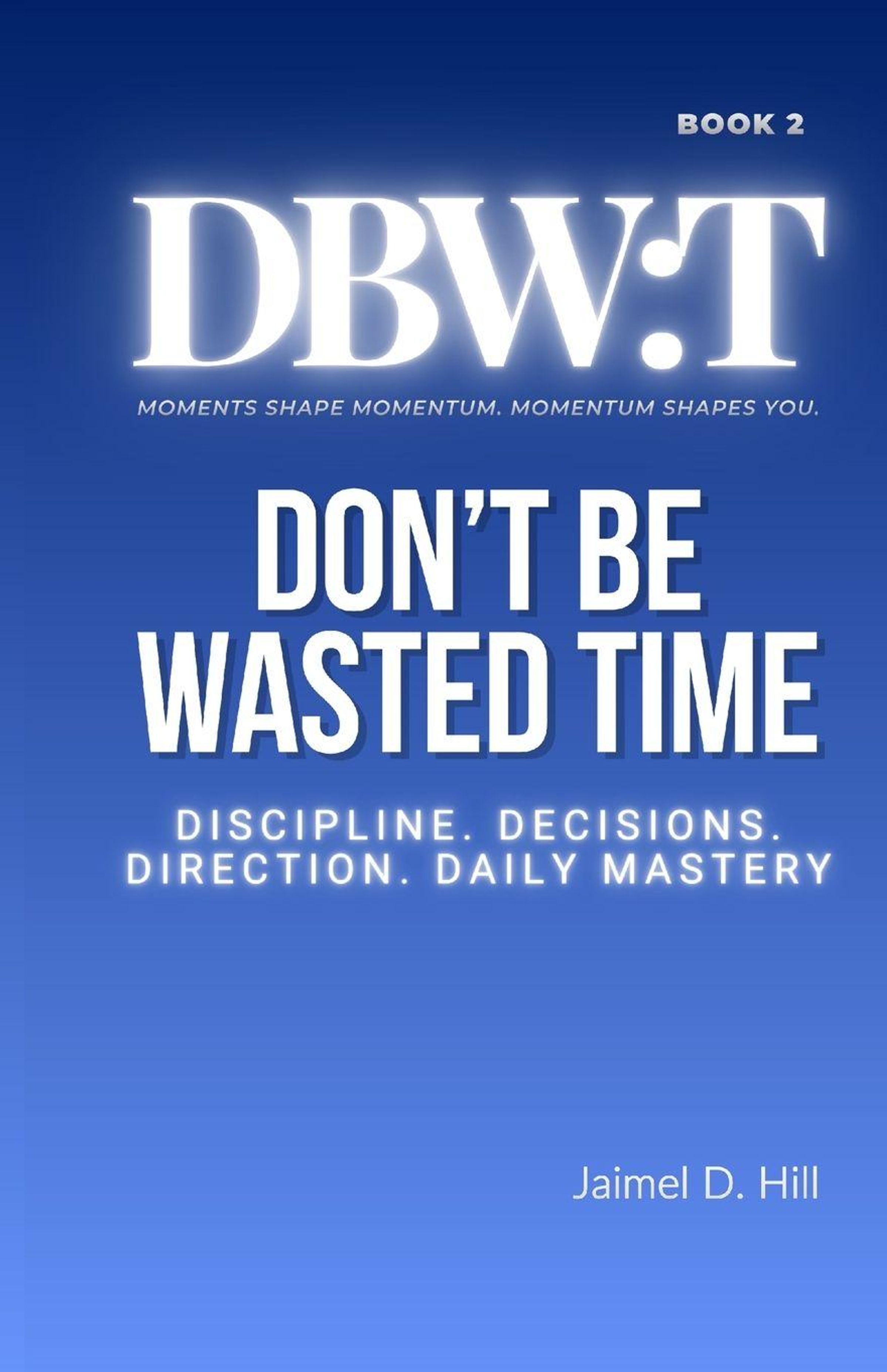 Text: "DBWT", "Don’t Be Wasted Time", "Discipline. Decisions. Direction. Daily Mastery", "Book 2", "Jaimel D. Hill". Blauer Hintergrund., Buch
