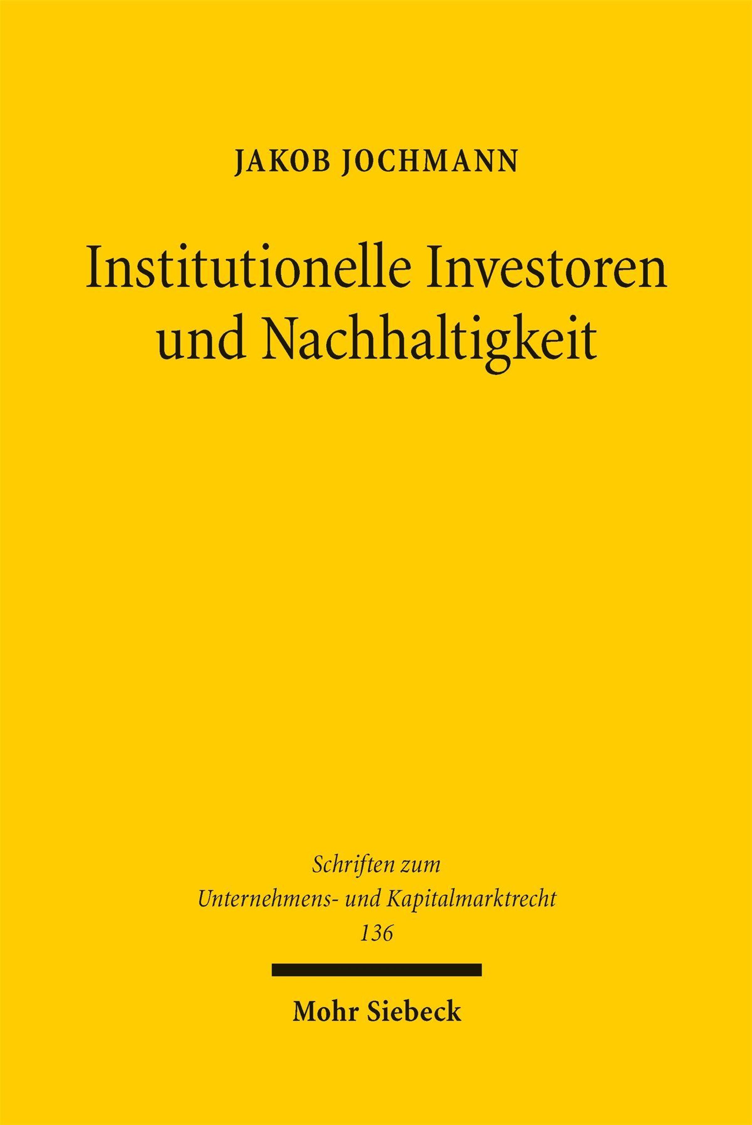 Institutional investors are expected to promote sustainability goals as shareholders in their portfolio companies. Jakob Jochmann explores this approach, which is discussed under the term ESG stewardship. He introduces ESG stewardship conceptually, analyses it from a law and economics perspective, examines its legal reality and doctrinal foundations, and addresses specific questions of legal policy.