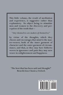 "This little volume, the result of meditation and experience ... is suggestive rather than explanatory. Its object being to stimulate men and women to the discovery and perception of the truth that- 'they themselves are makers of themselves' by virtue of the thoughts, which they choose and encourage; that mind is the master-weaver, both of the inner garment of character and the outer garment of circumstance, and that, as they may have hitherto woven in ignorance and pain they may now weave in enlightenment and happiness." - James Allen.