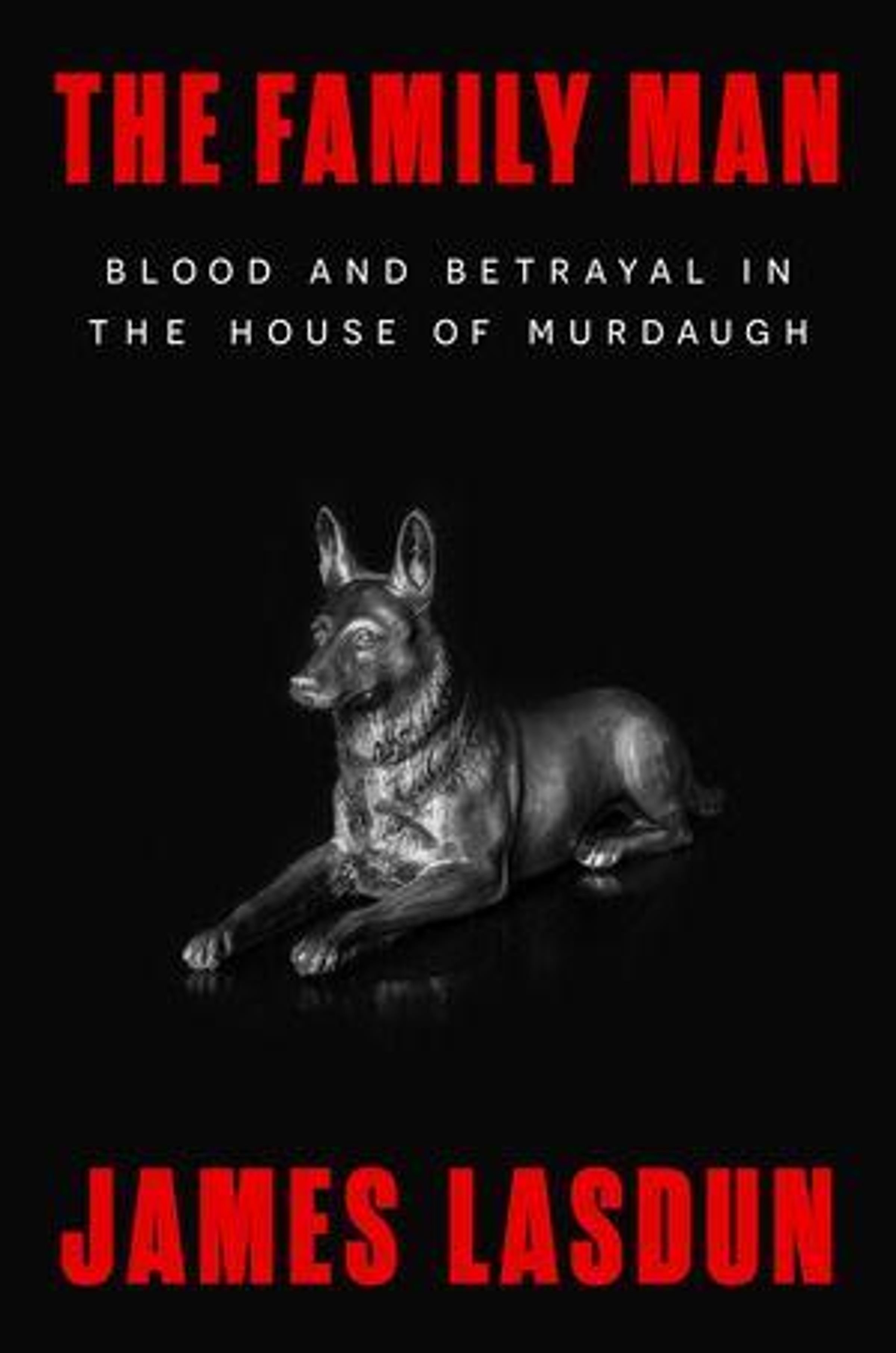 Text: "THE FAMILY MAN", "BLOOD AND BETRAYAL IN THE HOUSE OF MURDAUGH", "JAMES LASDUN". Silberne Hundeskulptur auf schwarzem Hintergrund., Buch