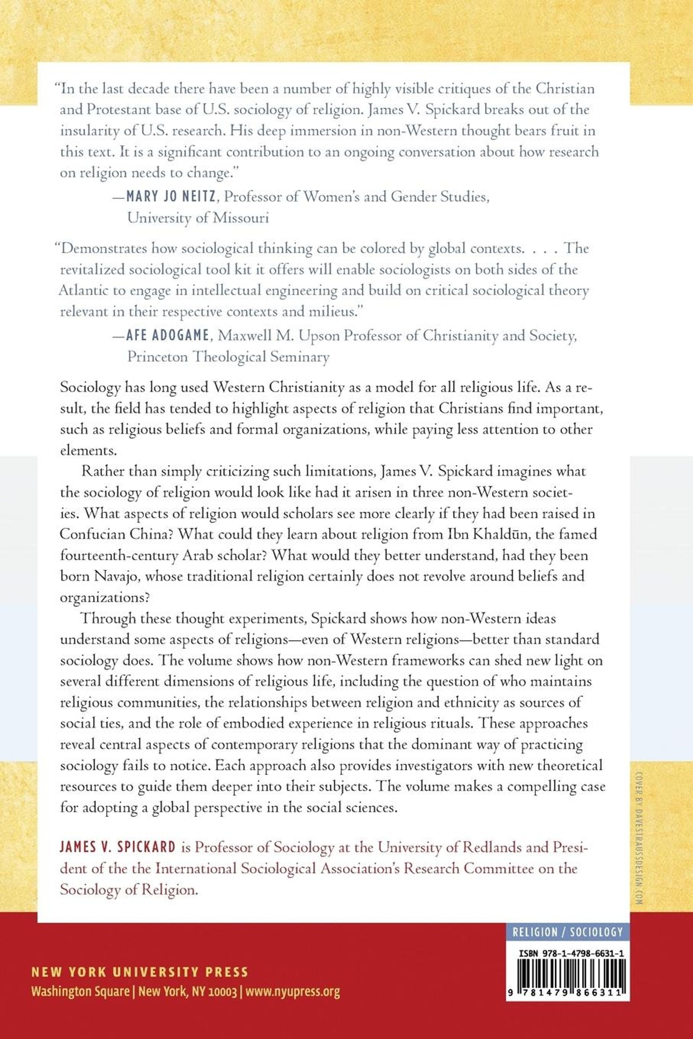 Sociology has long used Western Christianity as a model for all religious life. As a result, the field has tended to highlight aspects of religion that Christians find important, such as religious beliefs and formal organizations, while paying less attention to other elements. Rather than simply criticizing such limitations, James V. Spickard imagines what the sociology of religion would look like had it arisen in three non-Western societies. What aspects of religion would scholars see more clearly if they had been raised in Confucian China? What could they learn about religion from Ibn Khaldun, the famed 14th century Arab scholar? What would they better understand, had they been born Navajo, whose traditional religion certainly does not revolve around beliefs and organizations?