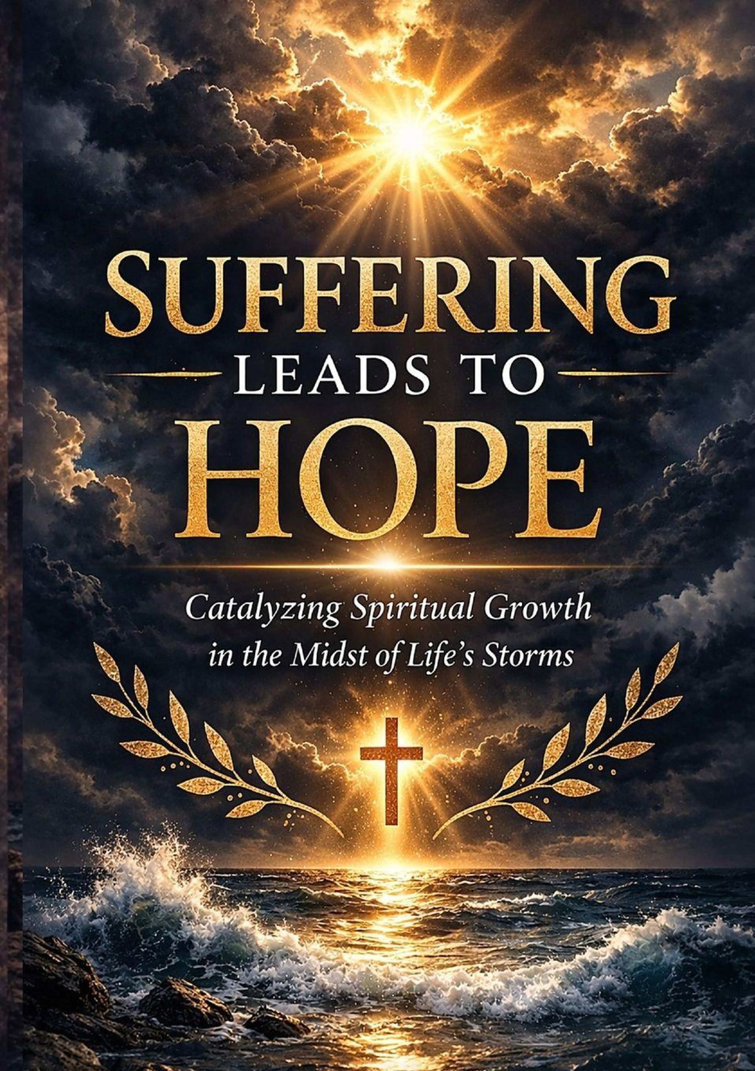 "Suffering leads to hope" steht über einer stürmischen See, beleuchtet von einem strahlenden Sonnenlicht hinter Wolken., Buch