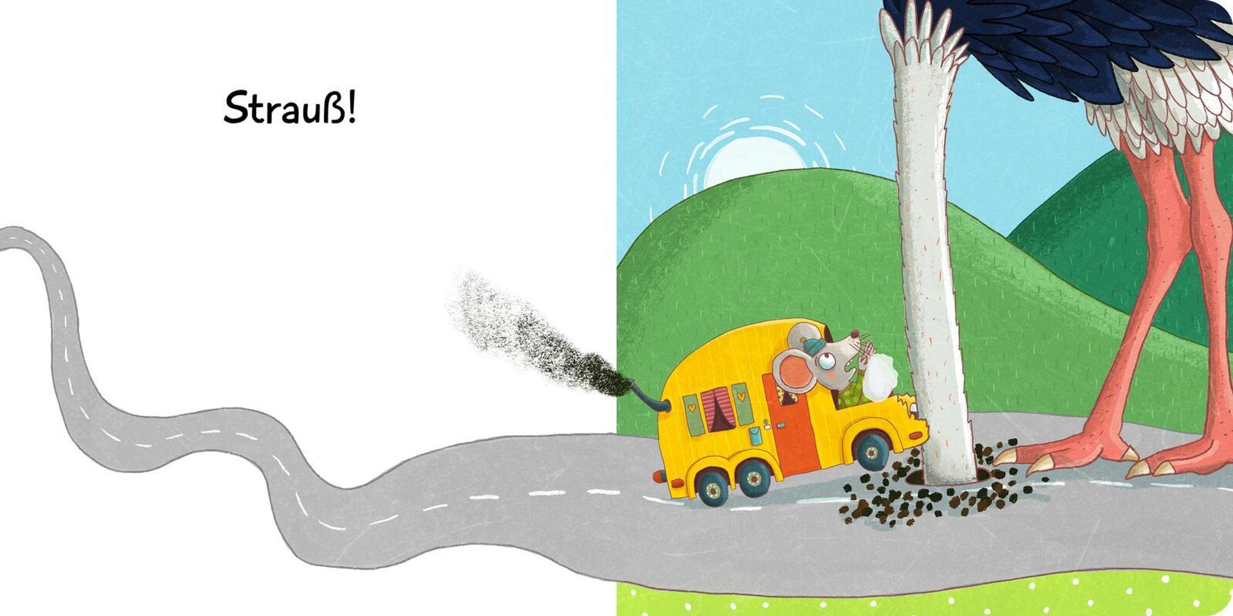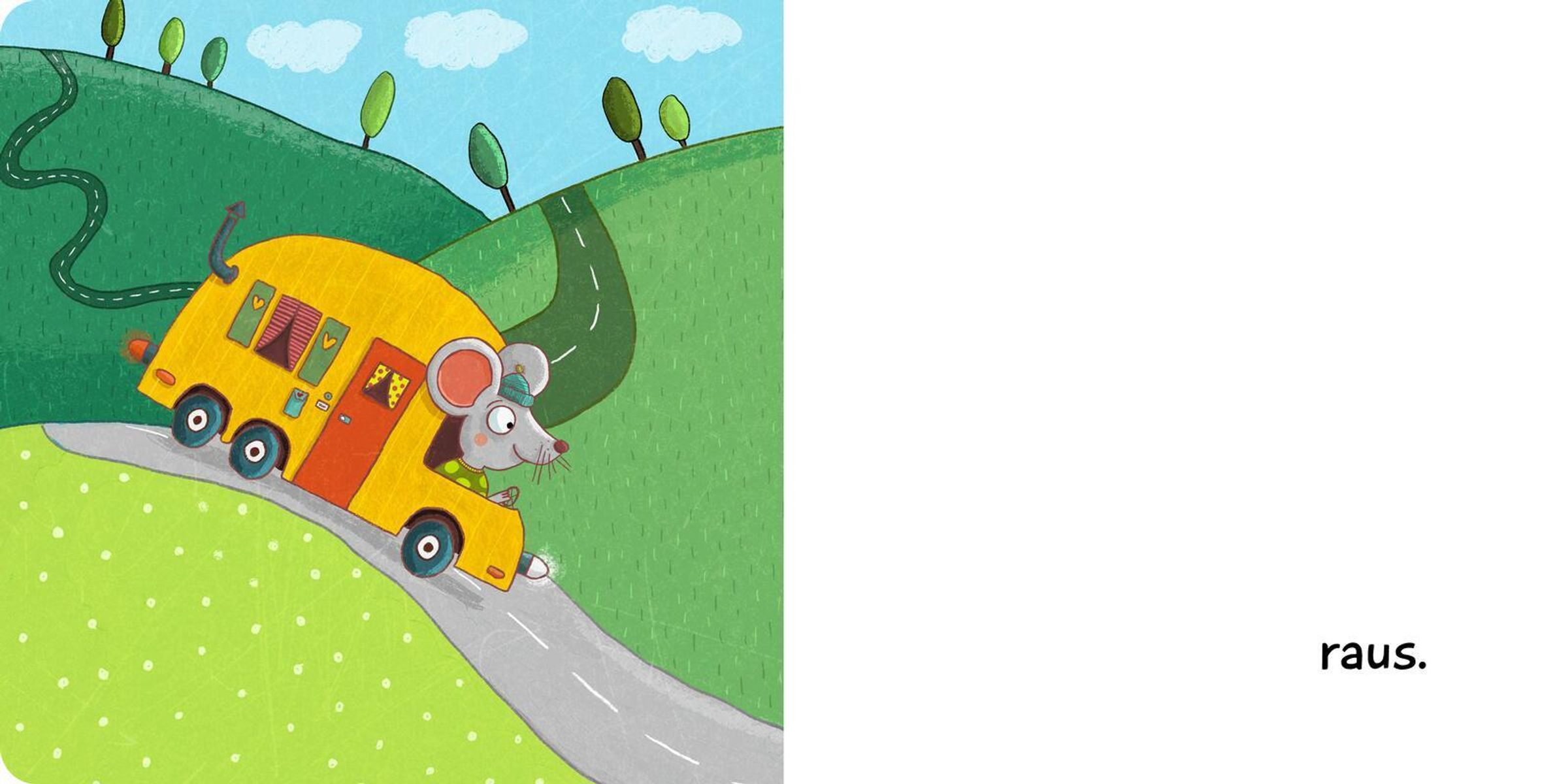 "Maus Haus raus" in großen, gelben Buchstaben auf hellblauem Hintergrund. Illustration: Maus in gelbem Bus., Buch