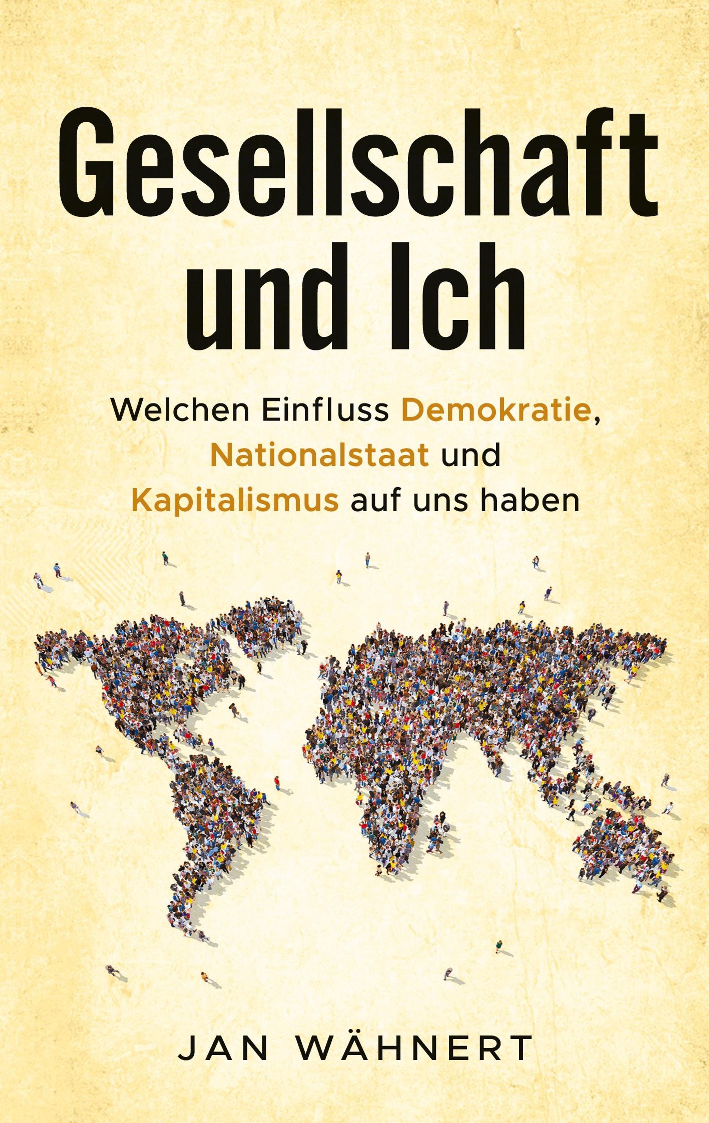 „Gesellschaft und Ich“: Einfluss von Demokratie, Nationalstaat und Kapitalismus. Unten viele Menschen als Weltkarte., Buch