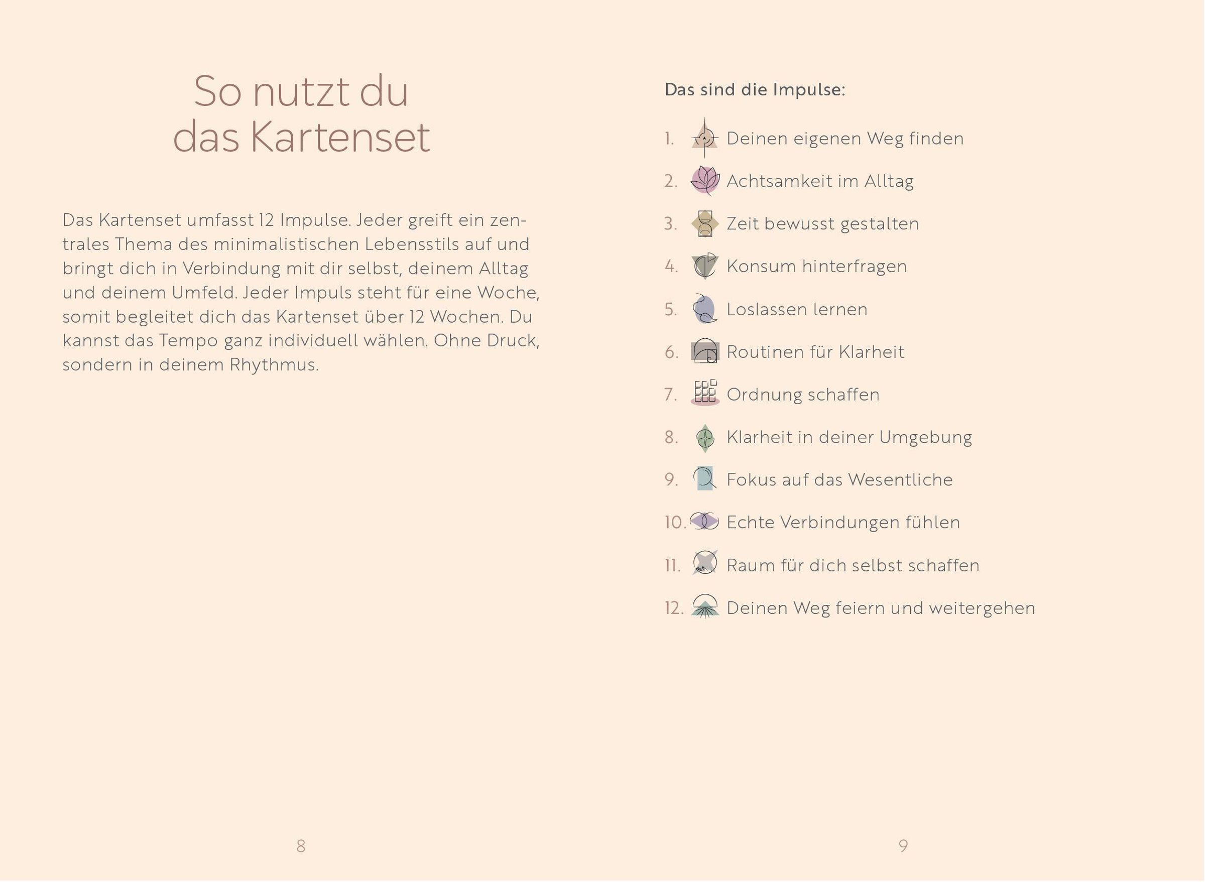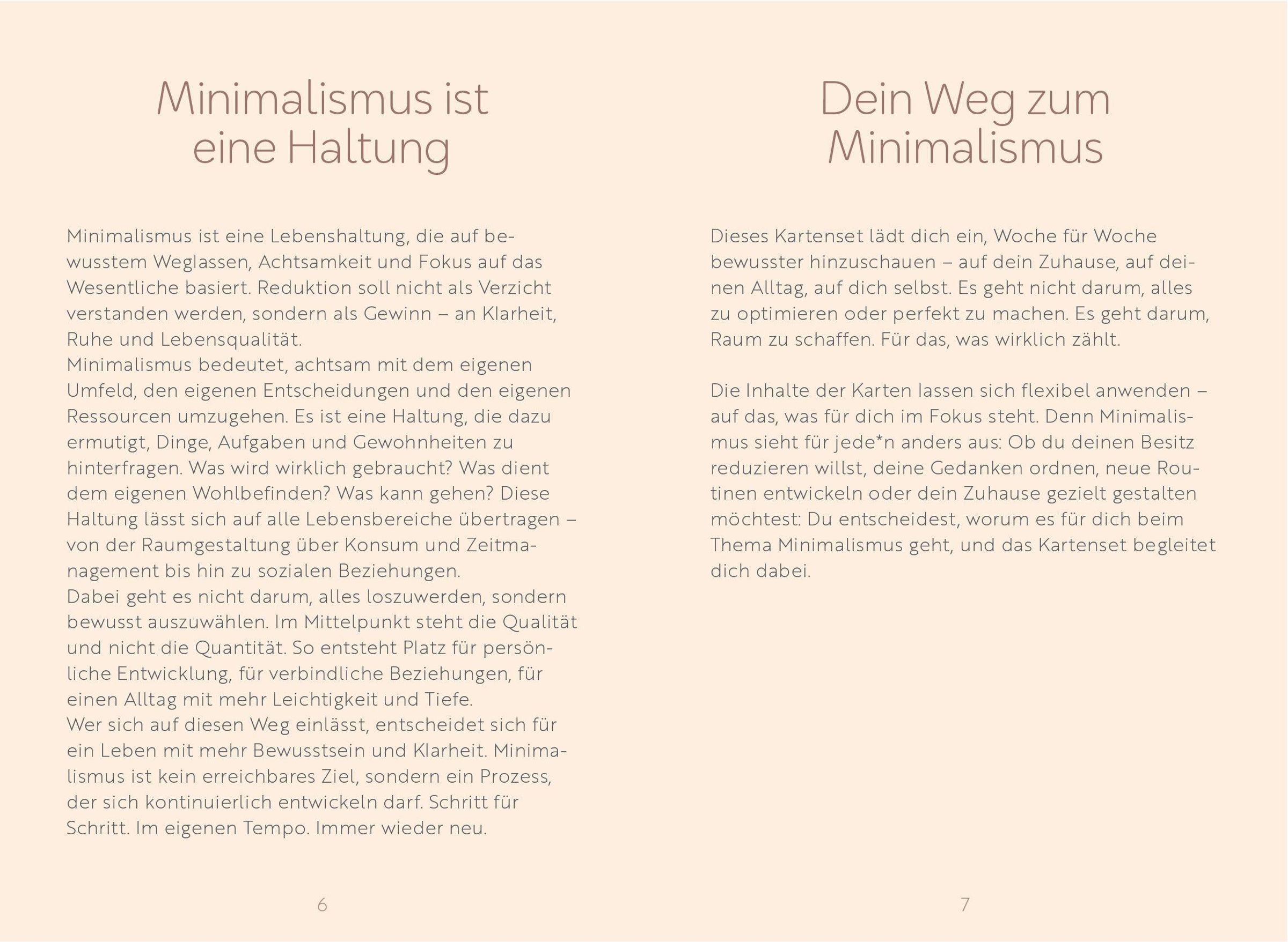Das Minimalismus-Kartenset begleitet über 12 Wochen mit klaren Impulsen, die Schritt für Schritt zu mehr Ordnung, Klarheit und innerer Ruhe führen. Jede Karte bietet Inspiration für Achtsamkeit, Konsumverhalten, Routinen oder Loslassen - flexibel anwendbar und ohne Druck. Mit stimmungsvoller Fotografie und einfachen Übungen wird der Weg zu mehr Leichtigkeit im Alltag praxisnah unterstützt.
