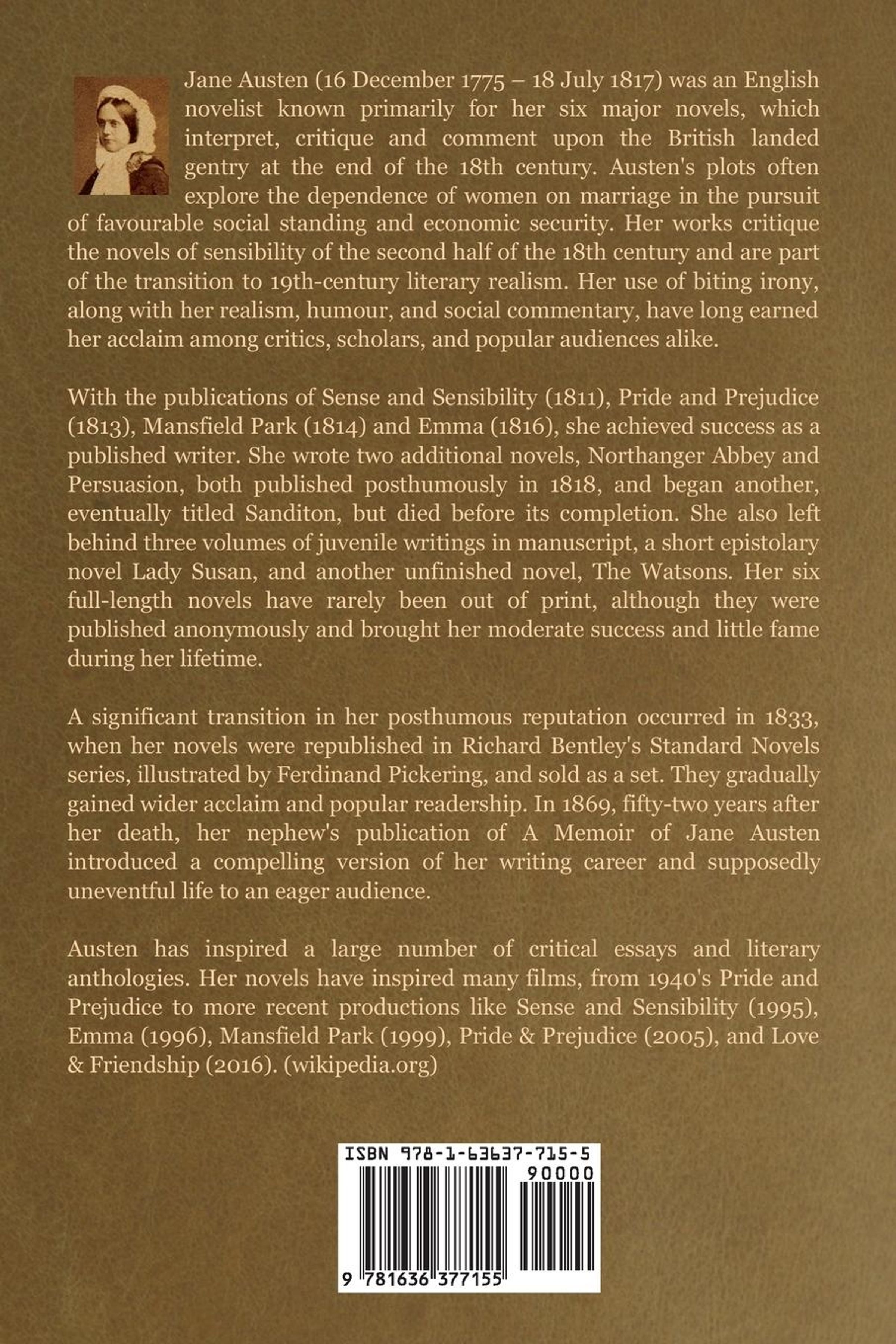 Born in 1775, Jane Austen published her many novels anonymously. Her work was not widely read until the late nineteenth century, and her fame only continued to grow from there. Known for her wit and sharp insight into social conventions, her novels about love, relationships, and society grow more popular year after year. She has earned her place in history as one of the most cherished writers in English literature.