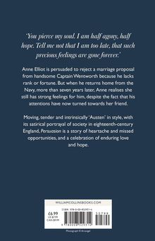 Moving, tender and intrinsically 'Austen' in style, with its satirical portrayal of society in eighteenth-century England, Persuasion is a story of heartache and missed opportunities, and a celebration of enduring love and hope.