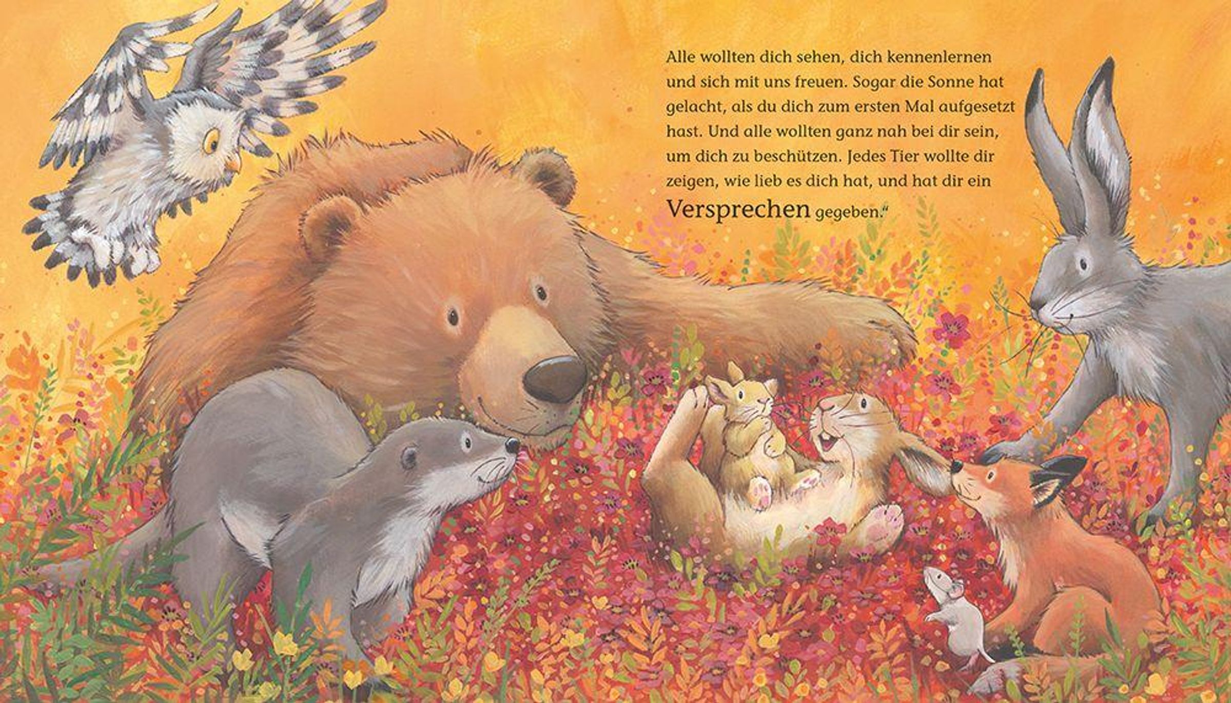Zarte Pfötchen, süße Schlappohren und große, staunende Augen - ein wahres Wunder auf der Blumenwiese. Und alle Tiere des Waldes sind gekommen, um es willkommen zu heißen. Und ihm zu zeigen, wie lieb sie es haben, jedes auf seine Art. Sie versprechen ihm Freundschaft, Schutz, Abenteuer und dass sie es niemals alleinlassen. Gemeinsam wollen sie mit ihm die Welt entdecken, mutig neue Wege gehen, lachen, spielen, hinfallen und wieder aufstehen - immer getragen von Liebe.