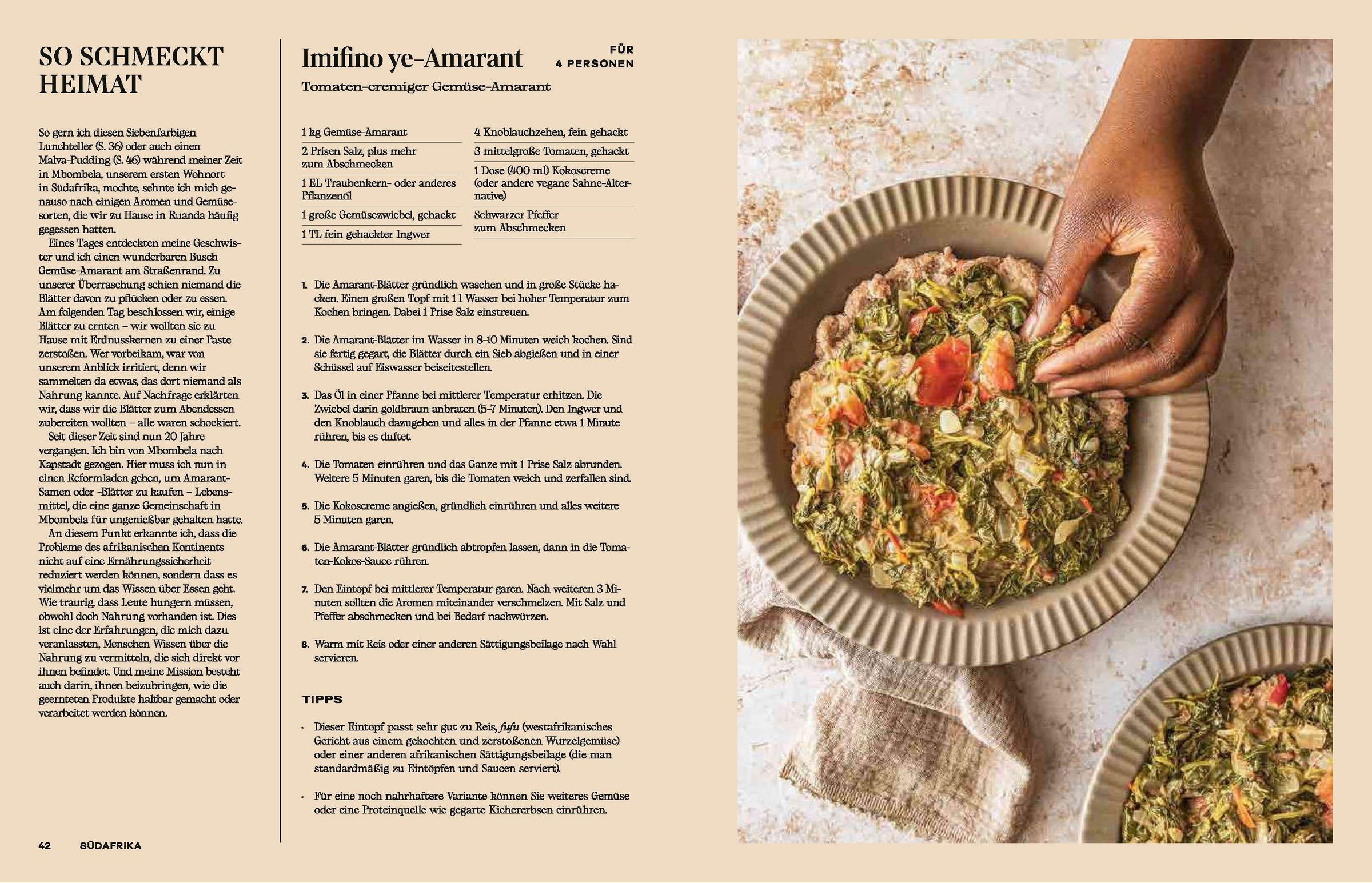 Rezepte wie Amaranth-Risotto aus Südafrika, würziger Maniok aus Ruanda, Jollof-Reis aus Ghana und marokkanische Gemüse-Tajine zeigen, wie "tamu" (lecker) die vegane afrikanische Küche ist. Über 70 vegane Rezepte verbinden tiefe kulinarische Wurzeln mit modernen, alltagstauglichen Interpretationen. Tipps und ein Guide zu gut erhältlichen Alternativen machen auch weniger bekannte Zutaten leicht zugänglich.