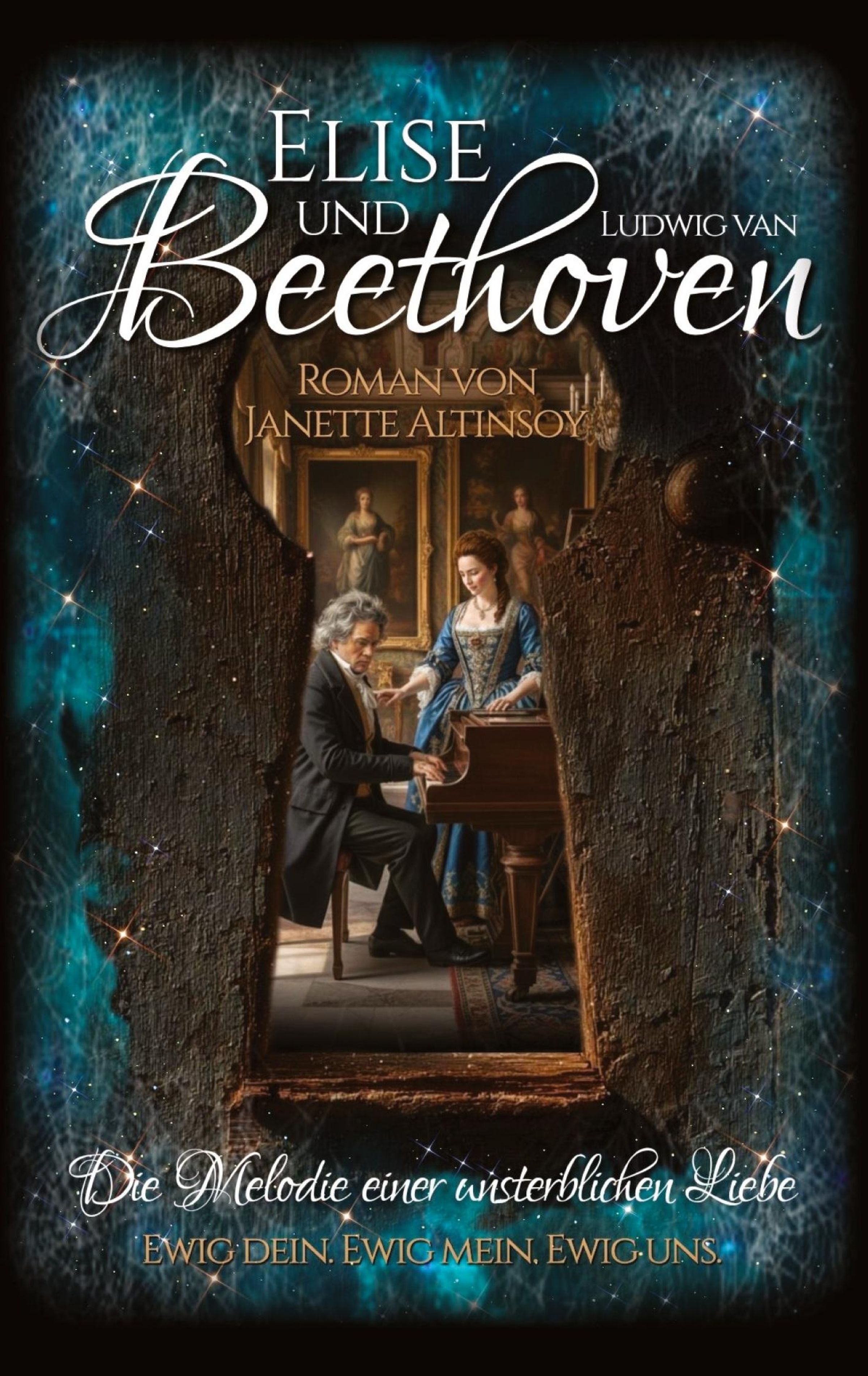 "Elise und Beethoven", "Roman von Janette Altinsoy", "Die Melodie einer unsterblichen Liebe". Gemälde: Mann am Klavier mit Frau., Buch