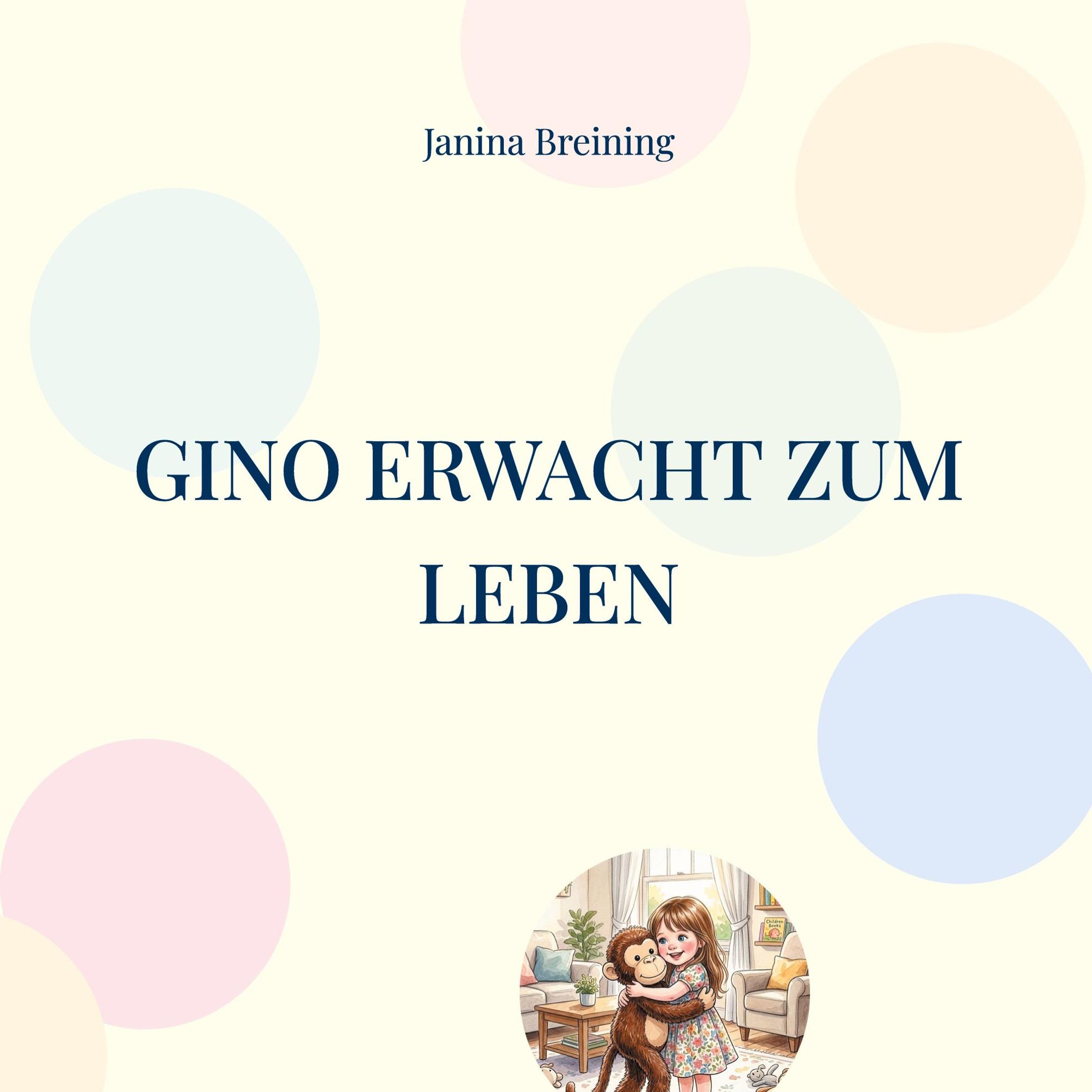 Text: "Janina Breining", "GINO ERWACHT ZUM LEBEN". Illustration: Ein Mädchen umarmt einen Affen in einem farbenfrohen Raum., Buch
