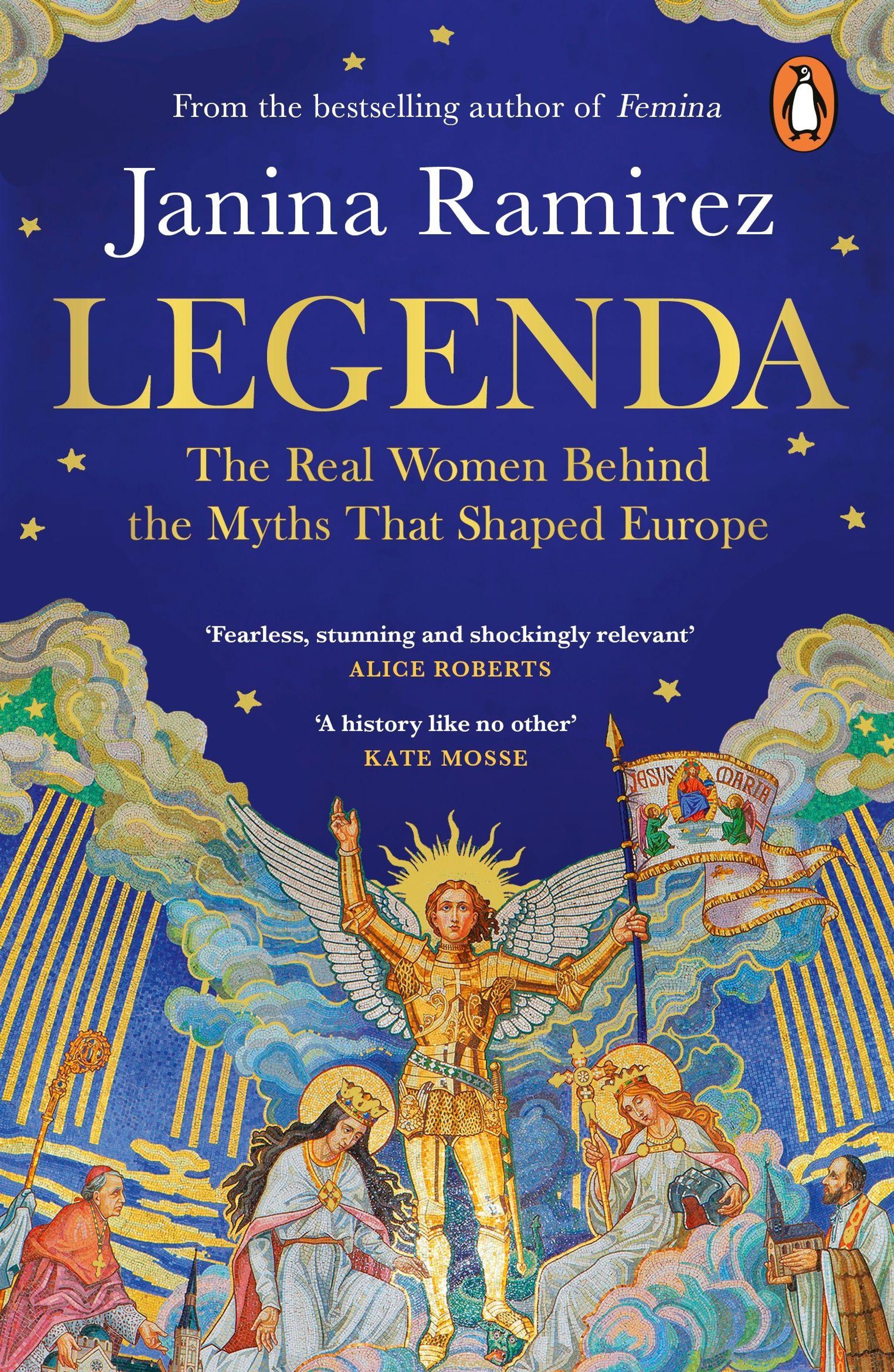 Buchtitel: "Janina Ramirez - LEGENDA" mit Untertitel: "The Real Women Behind the Myths That Shaped Europe", blau-goldene Illustration., Buch
