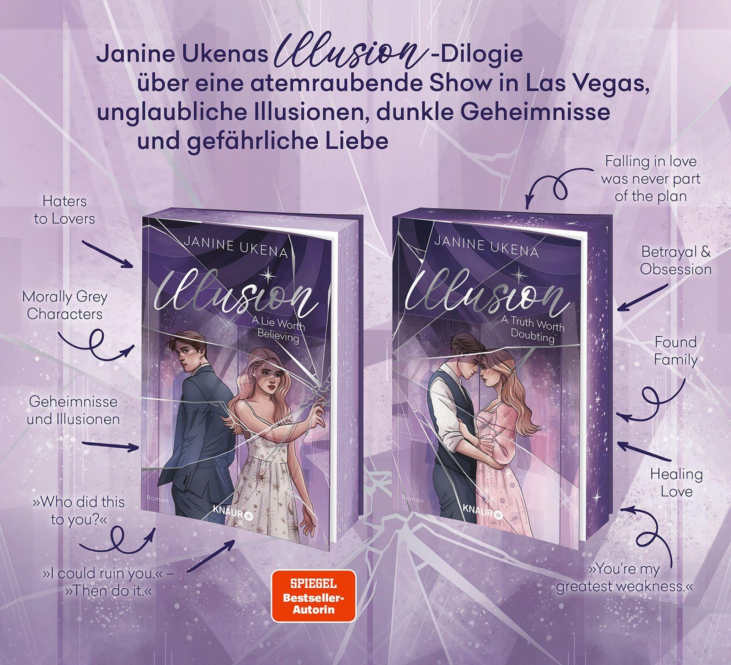 'Illusion - A Truth Worth Doubting' ist der zweite Band der New-Adult-Suspense-Dilogie von SPIEGEL-Bestellerautorin Janine Ukena, in der sie ihre Leserinnen und Leser ins schillernde Las Vegas entführt. Hier erwarten euch Intrigen, Verführung, Täuschung, große Träume und eine Liebe, die durch ein fatales Geheimnis erschüttert wird ...