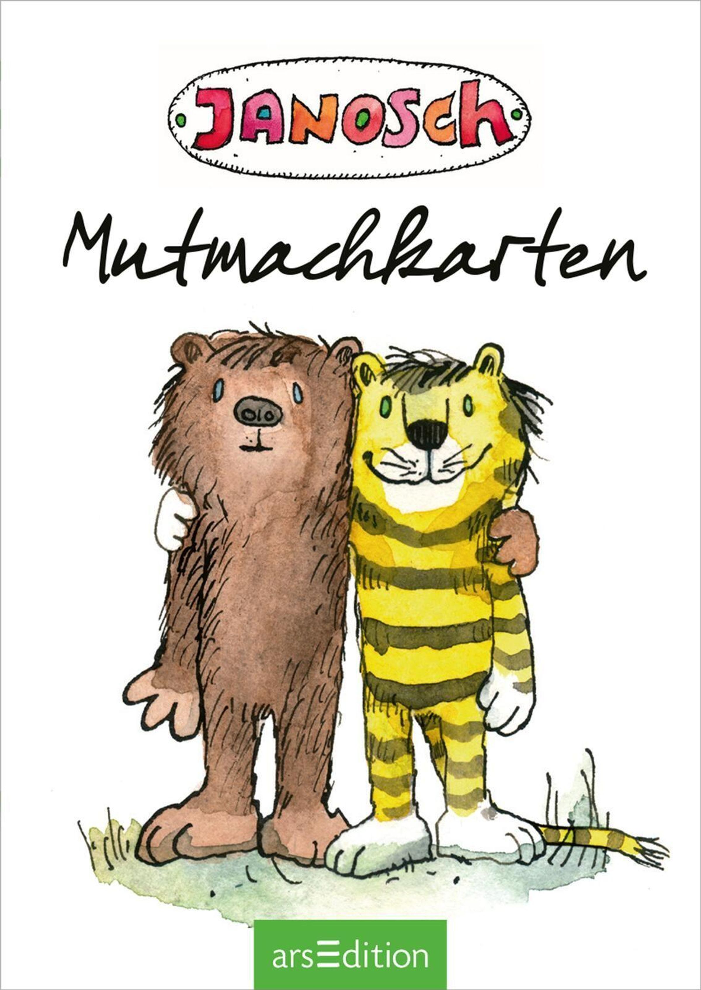 „Mutmachkarten“ steht unter einem bunten „Janosch“-Logo. Ein Bär und Tiger umarmen sich. Unten „arsEdition“., Buch