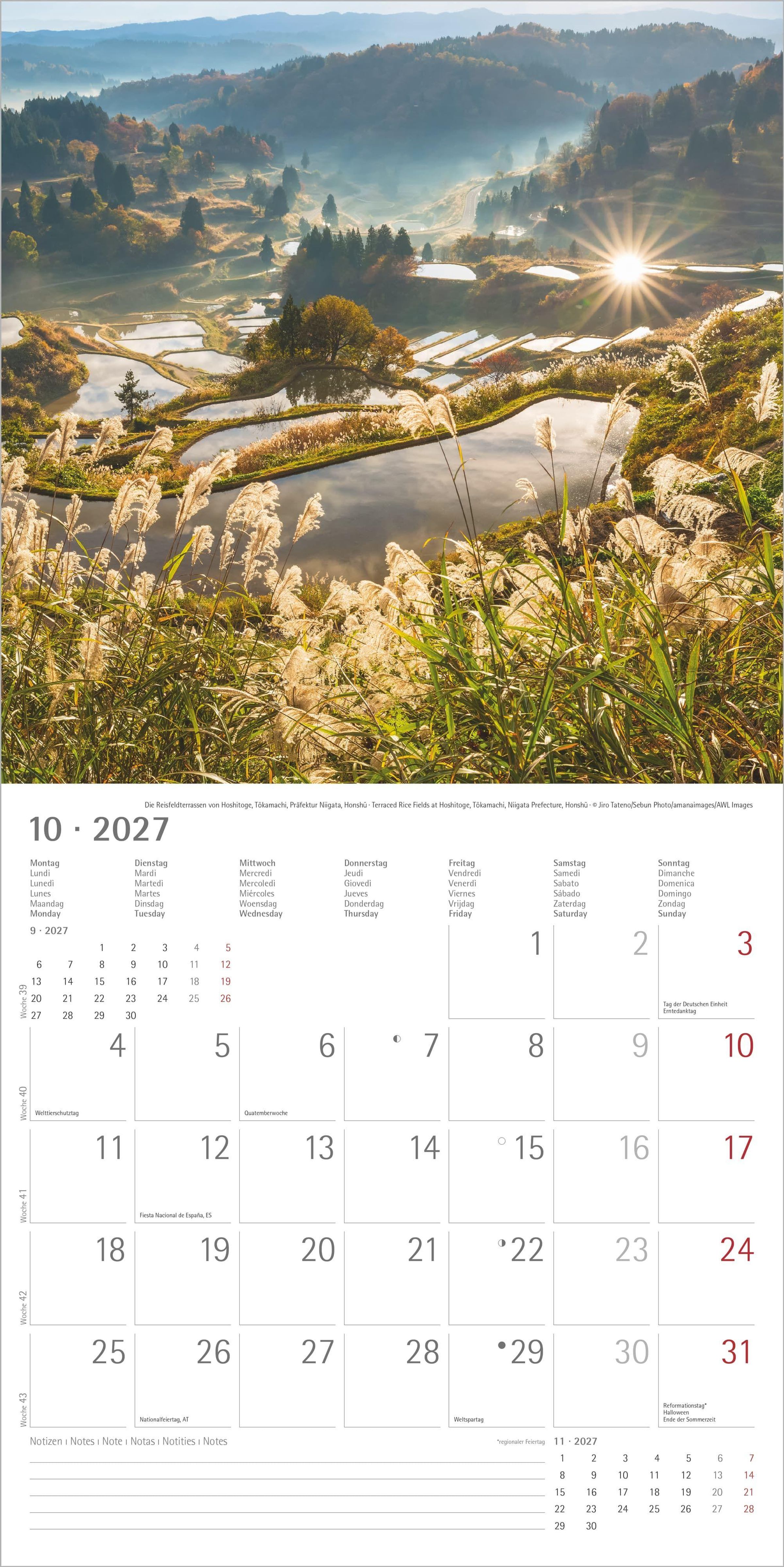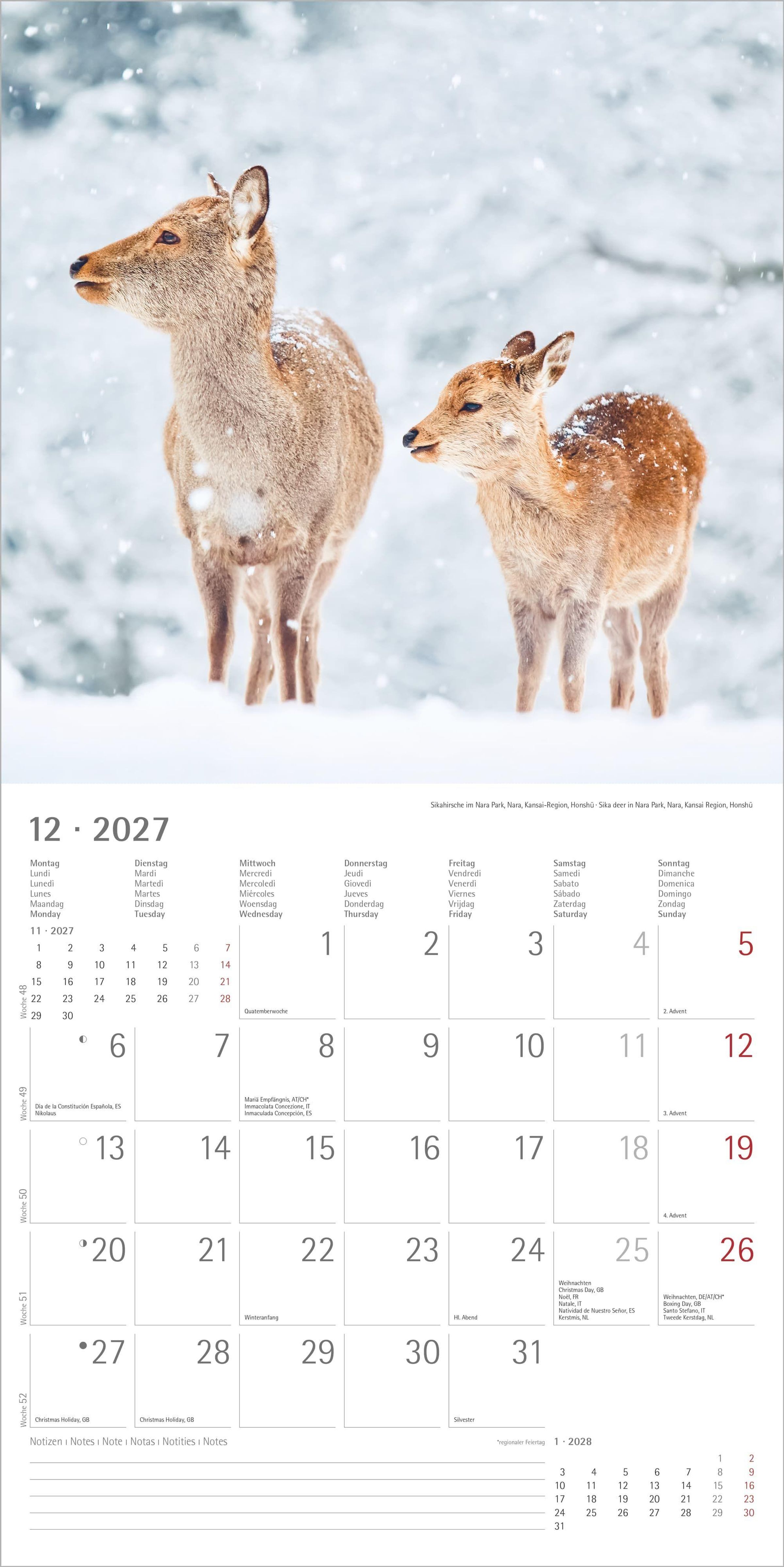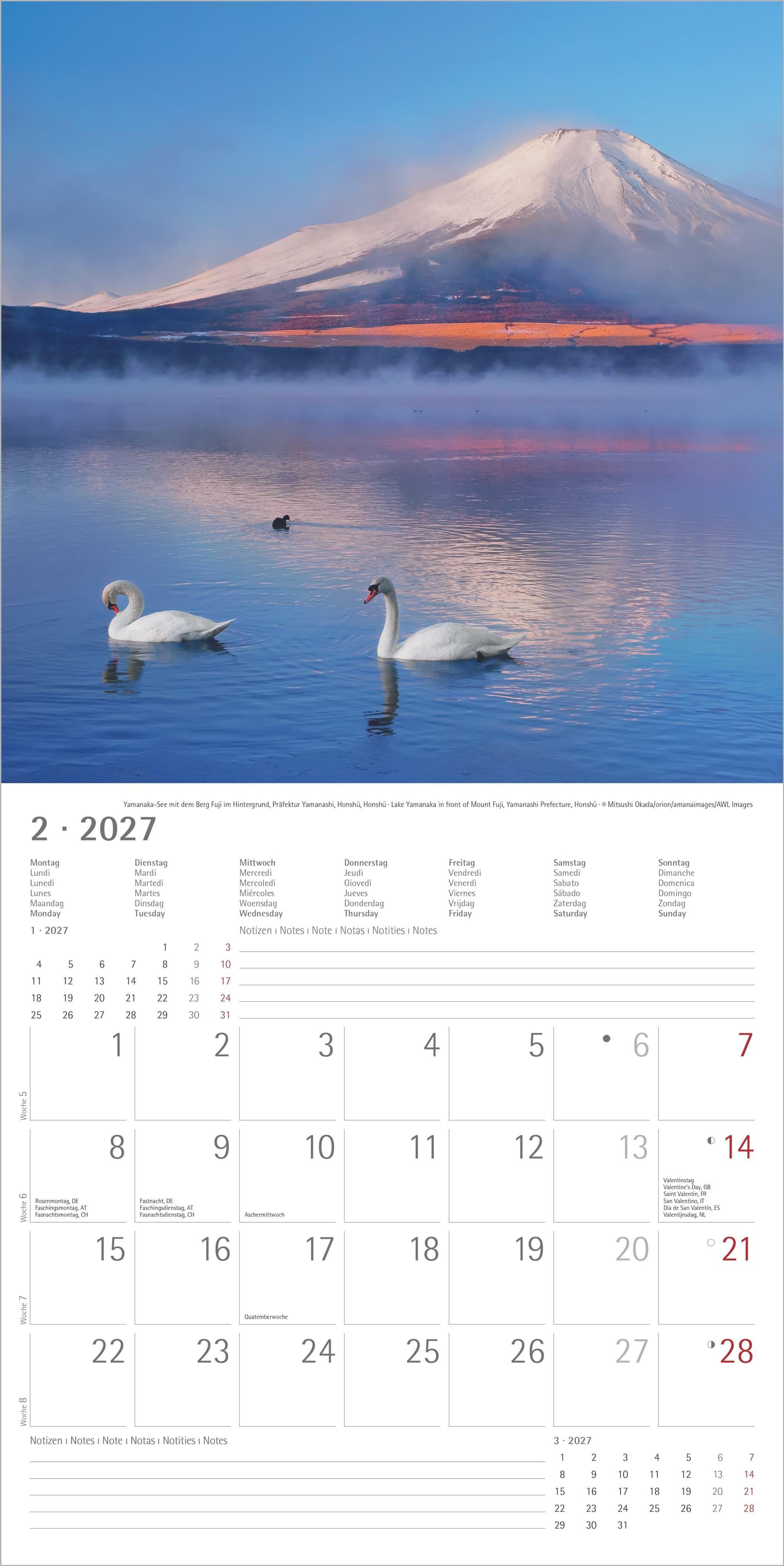 Im großzügigen Format 30 x 30 cm (aufgeklappt 30 x 60 cm) kommen die stimmungsvollen Aufnahmen internationaler Meisterfotografen besonders gut zur Geltung. Das übersichtliche, 6-sprachige Kalendarium informiert zuverlässig über internationale Feiertage und Mondphasen, bietet viel Platz für persönliche Termine und Notizen und erleichtert die Monatsplanung.