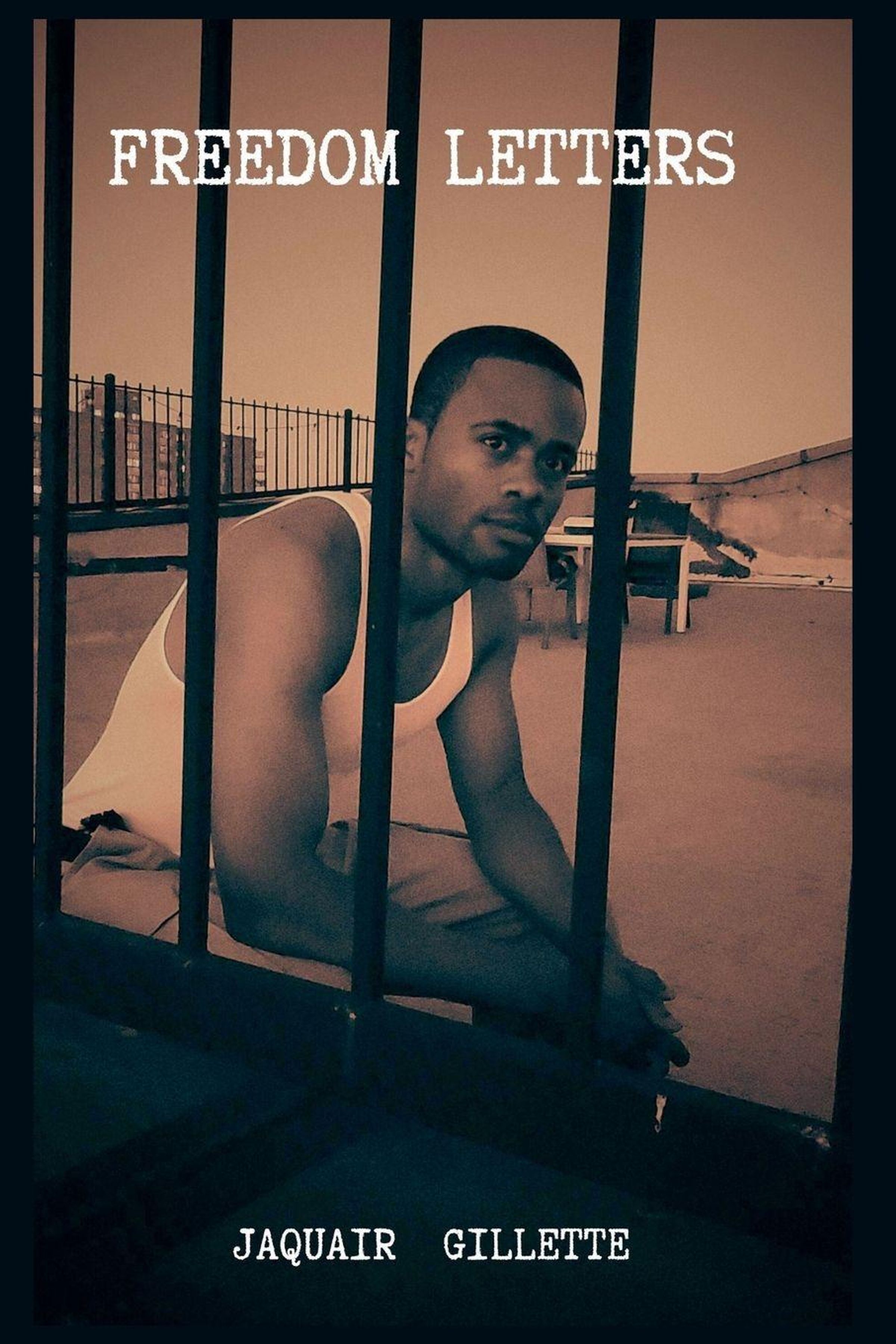 Text: "FREEDOM LETTERS," "JAQUAIR GILLETTE." Ein Mann in einem weißen Tanktop sitzt hinter Gitterstäben., Buch