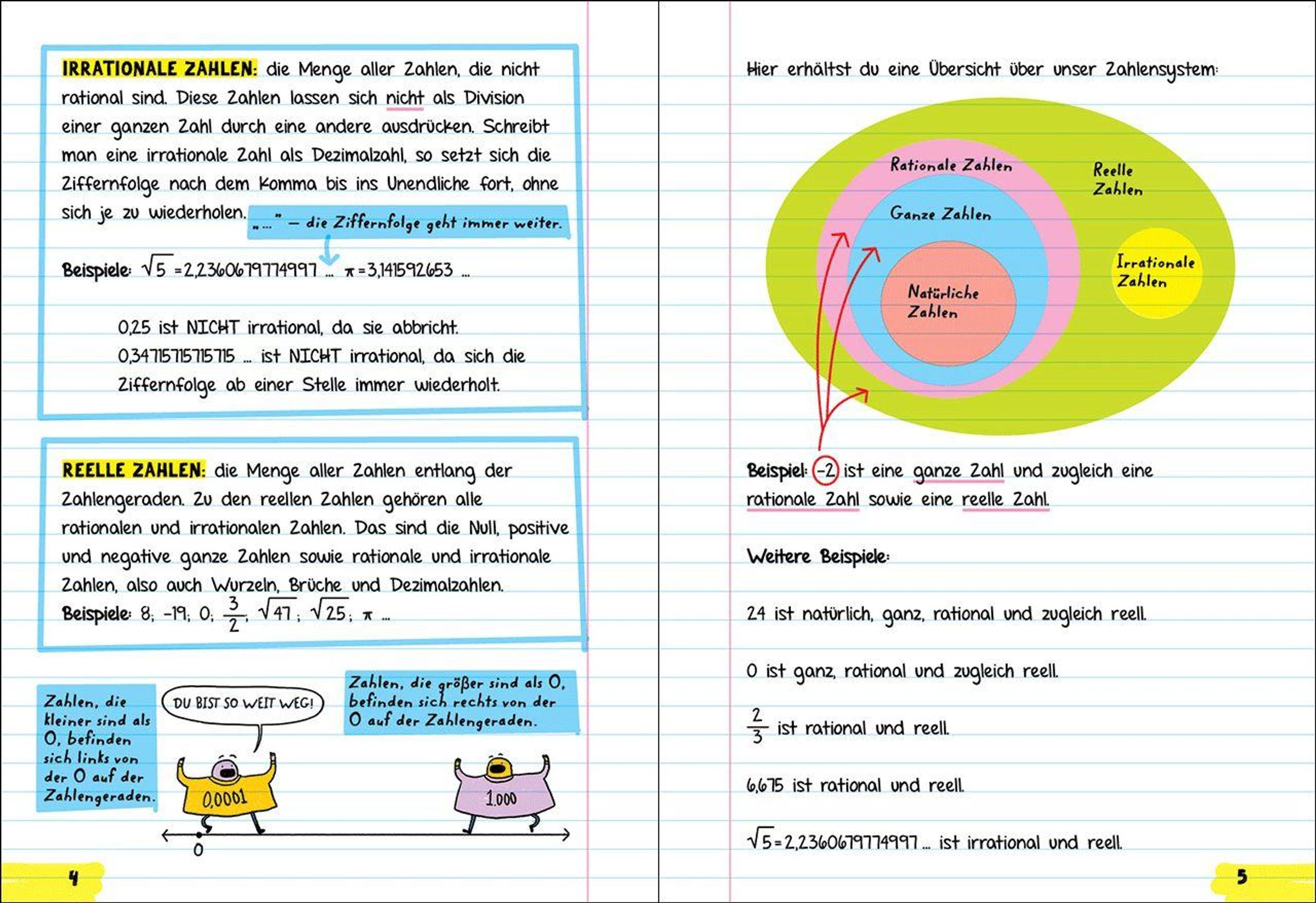 Definitionen, Tipps und Tricks werden in diesem umfassenden Nachschlagewerk und Übungsbuch ergänzt durch abwechslungsreiche Übungen aus dem Fachbereich Algebra. Zwischen modernen Scribbles, Cartoons und witzigen Kommentaren findet sich alles Wichtige zur Auffrischung, Vertiefung und Festigung des Lernstoffs von der 5. bis zur 9. Klasse, der durch kurze Tests am Ende jeder Lektion wiederholt und eingeprägt werden kann.