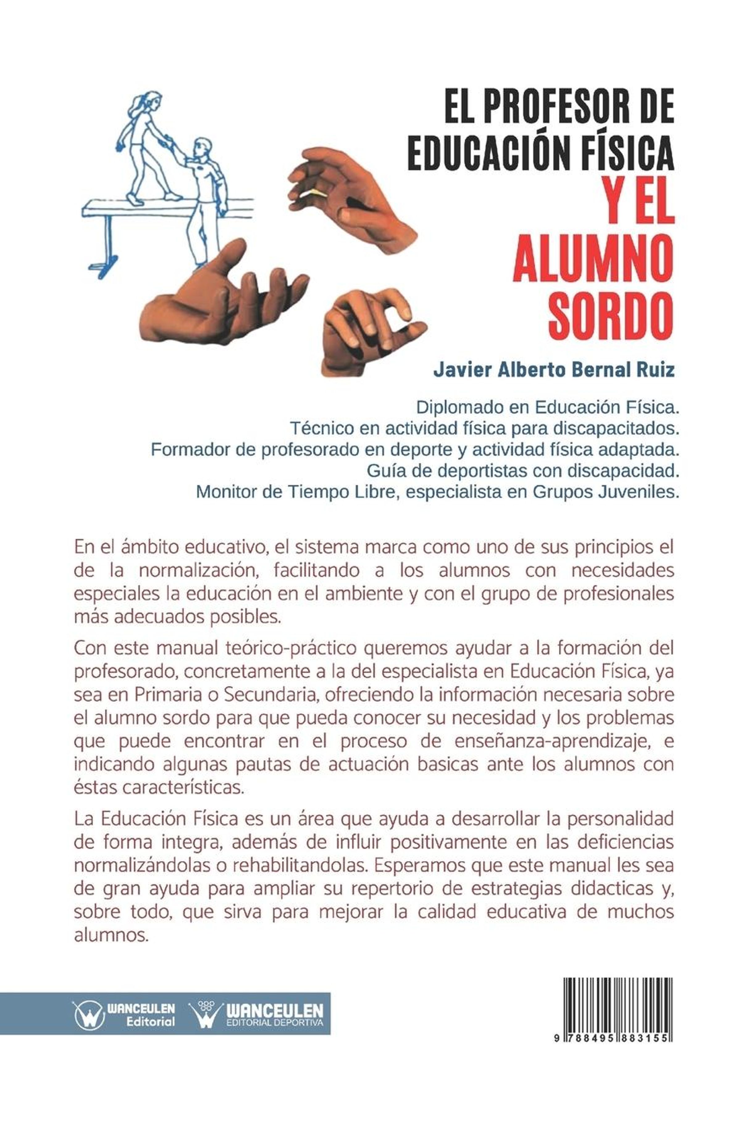 En el ámbito educativo, el sistema marca como uno de sus principios el de la normalización facilitando a los alumnos con necesidades especiales la educación en el ambiente y con el grupo de profesionales más educados posibles. Con este manual teórico-práctico queremos ayudar a la formación del profesorado, concretamente a la del especialista en Educación Física, ya sea en Primaria o Secundaria, ofreciendo la información necesaria sobre el alumno sordo para que pueda conocer su necesidad y los problemas que puede encontrar en el proceso de enseñanza-aprendizaje, e indicando algunas pautas de actuación básicas ante los alumnos con estas características. La Educación Física es un área que ayuda a desarrollar la personalidad de forma íntegra, además de influir positivamente en las deficiencias normalizándolas o rehabilitándolas. Esperamos que este manual les sea de gran ayuda para ampliar su repertorio de estrategias didácticas y, sobre todo, que sirva para mejorar la calidad educativa de muchos alumnos.