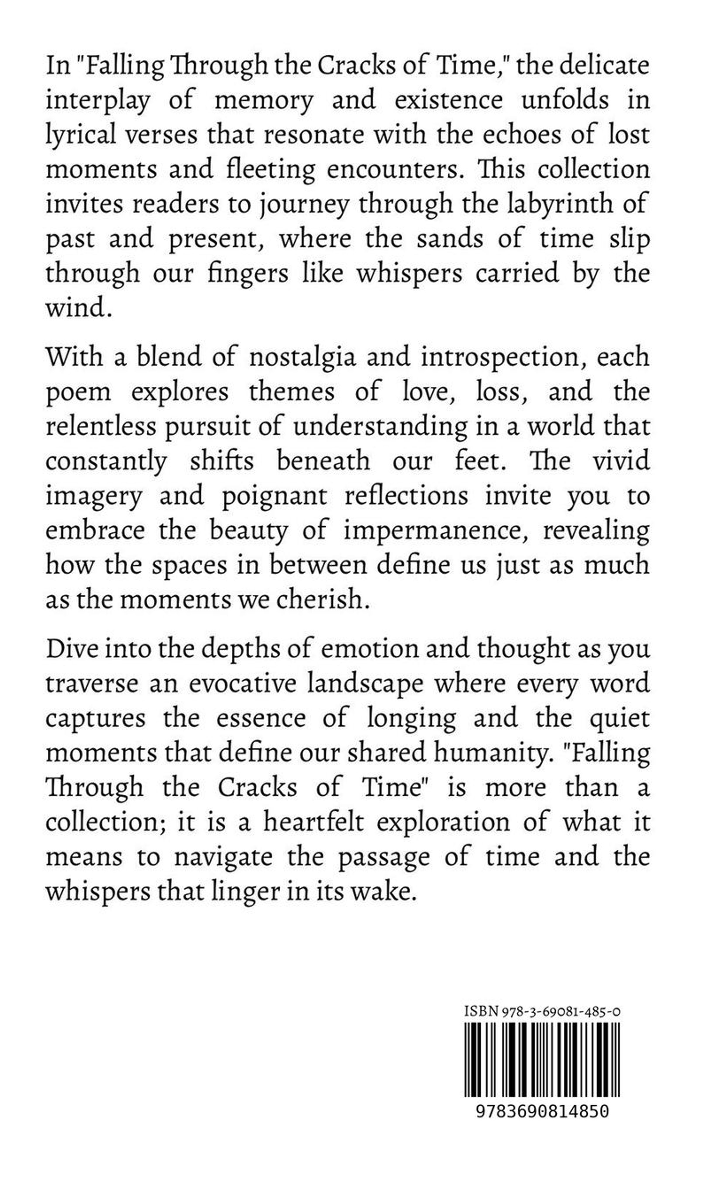 In "Falling Through the Cracks of Time," the delicate interplay of memory and existence unfolds in lyrical verses that resonate with the echoes of lost moments and fleeting encounters. This collection invites readers to journey through the labyrinth of past and present, where the sands of time slip through our fingers like whispers carried by the wind. With a blend of nostalgia and introspection, each poem explores themes of love, loss, and the relentless pursuit of understanding in a world that constantly shifts beneath our feet. The vivid imagery and poignant reflections invite you to embrace the beauty of impermanence, revealing how the spaces in between define us just as much as the moments we cherish. Dive into the depths of emotion and thought as you traverse an evocative landscape where every word captures the essence of longing and the quiet moments that define our shared humanity. "Falling Through the Cracks of Time" is more than a collection; it is a heartfelt exploration of what it means to navigate the passage of time and the whispers that linger in its wake.