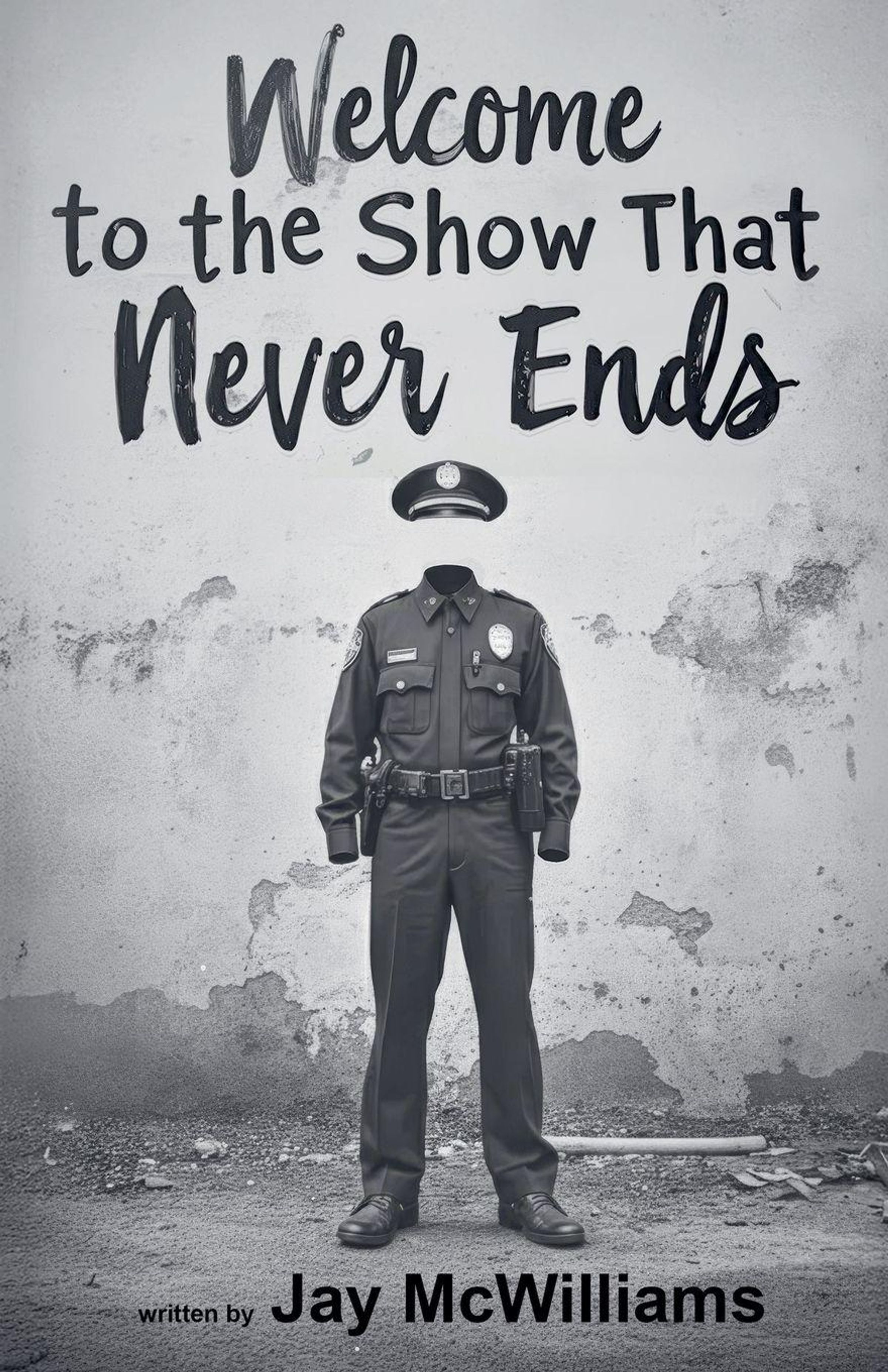 Text: "Welcome to the Show That Never Ends" und "written by Jay McWilliams". Illustration: Leere Polizei-Uniform vor grober Wand., Buch