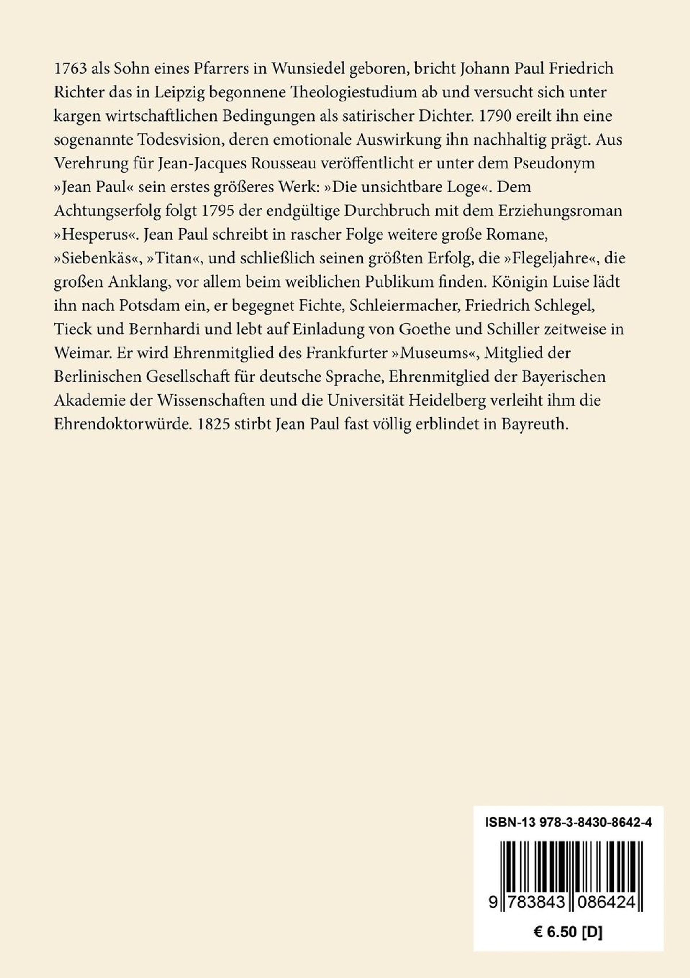 1763 als Sohn eines Pfarrers in Wunsiedel geboren, bricht Johann Paul Friedrich Richter das in Leipzig begonnene Theologiestudium ab und versucht sich unter kargen wirtschaftlichen Bedingungen als satirischer Dichter. 1790 ereilt ihn eine sogenannte Todesvision, deren emotionale Auswirkung ihn nachhaltig prägt. Aus Verehrung für Jean-Jacques Rousseau veröffentlicht er unter dem Pseudonym >>Jean Paul<< sein erstes größeres Werk: >>Die unsichtbare Loge<<. Dem Achtungserfolg folgt 1795 der endgültige Durchbruch mit dem Erziehungsroman >>Hesperus<<. Jean Paul schreibt in rascher Folge weitere große Romane, >>Siebenkäs<<, >>Titan<<, und schließlich seinen größten Erfolg, die >>Flegeljahre<<, die großen Anklang, vor allem beim weiblichen Publikum finden. Königin Luise lädt ihn nach Potsdam ein, er begegnet Fichte, Schleiermacher, Friedrich Schlegel, Tieck und Bernhardi und lebt auf Einladung von Goethe und Schiller zeitweise in Weimar. Er wird Ehrenmitglied des Frankfurter >>Museums<<, Mitglied der Berlinischen Gesellschaft für deutsche Sprache, Ehrenmitglied der Bayerischen Akademie der Wissenschaften und die Universität Heidelberg verleiht ihm die Ehrendoktorwürde. 1825 stirbt Jean Paul fast völlig erblindet in Bayreuth.
