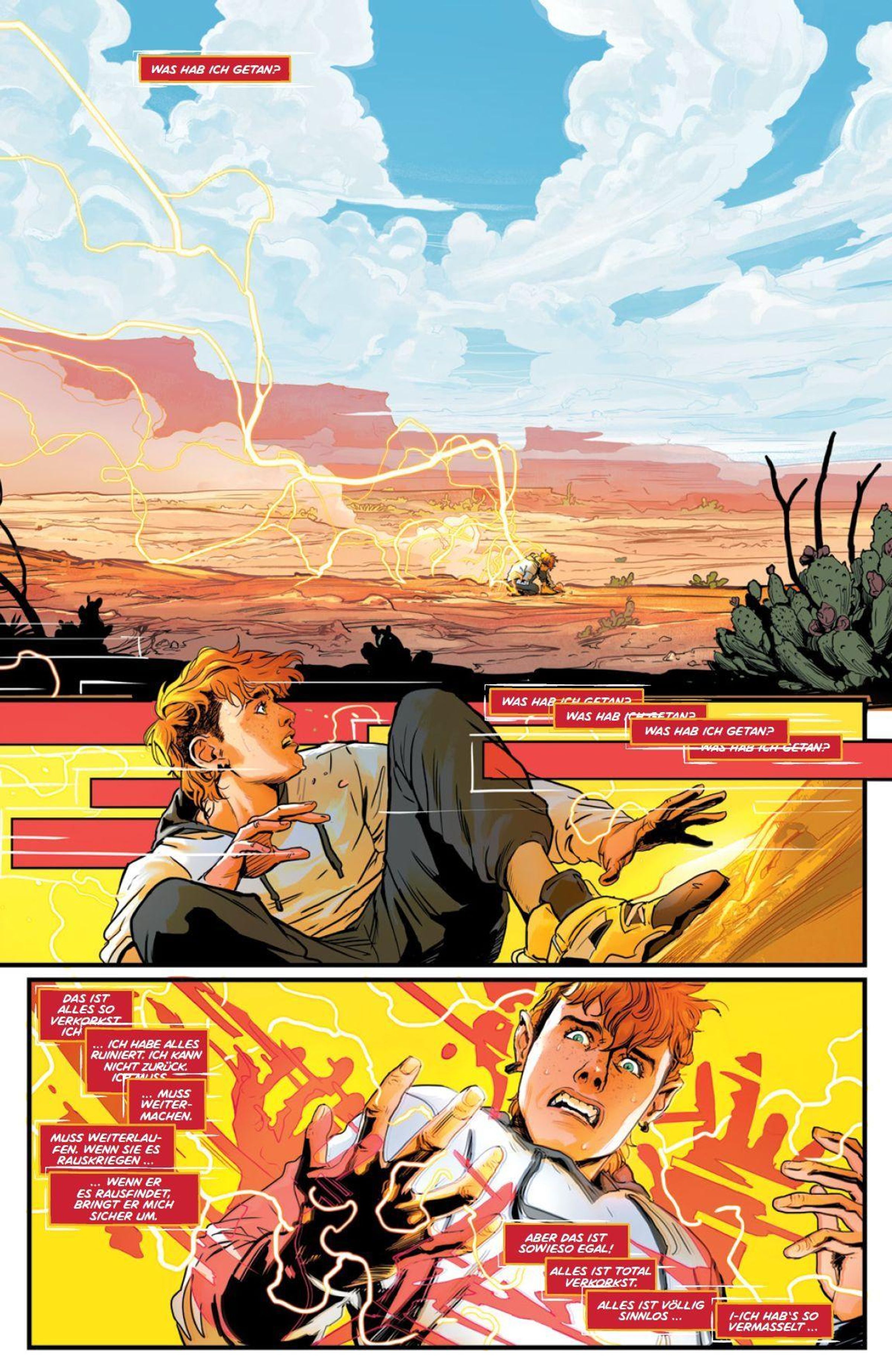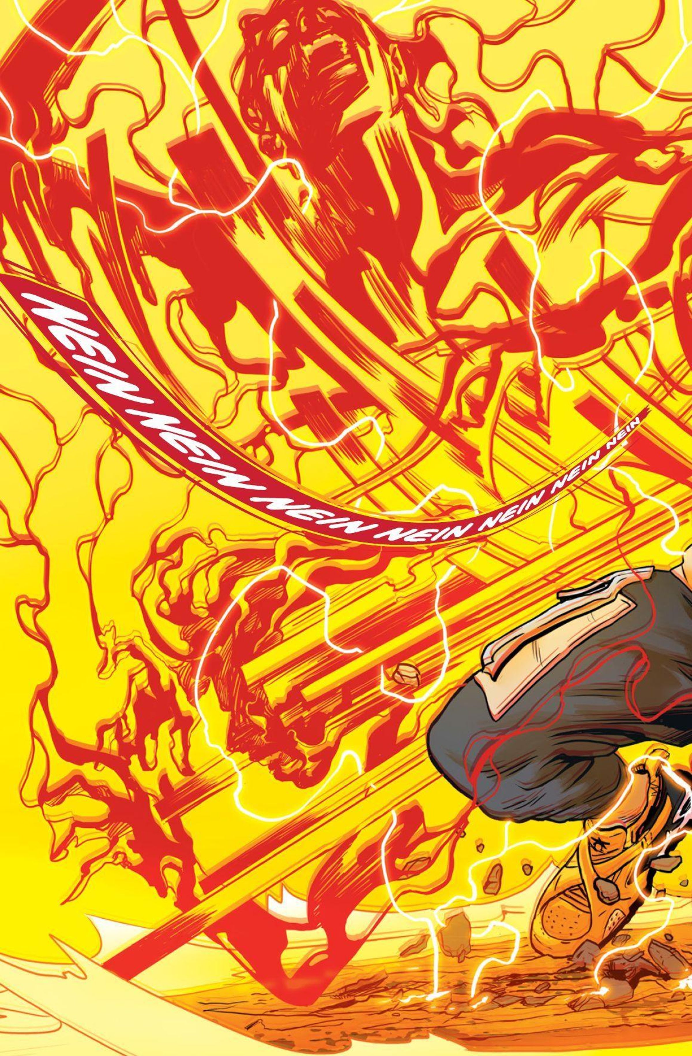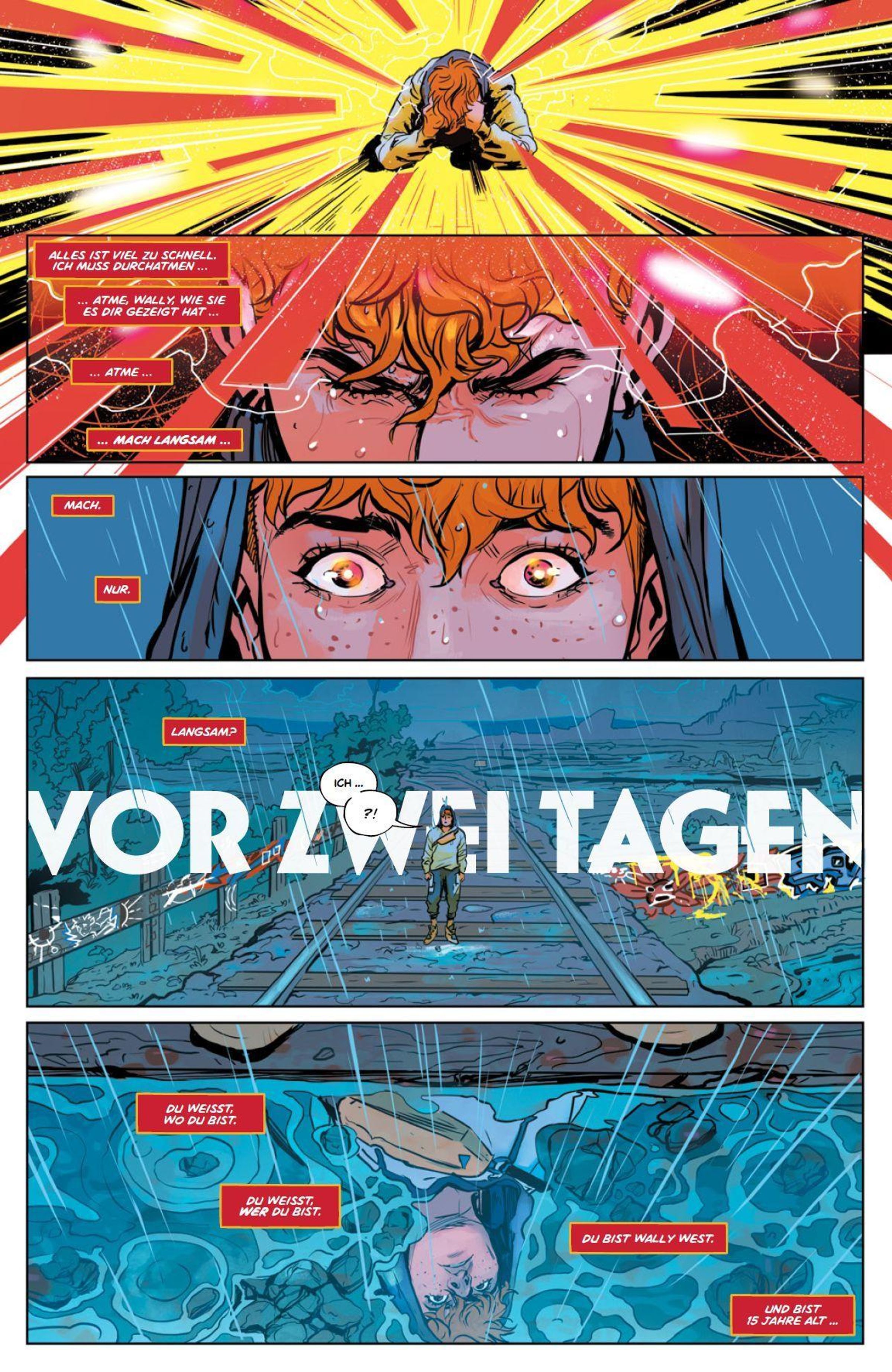 RENN UM DEIN LEBEN! Im neuen, finsteren Absolute-Universum hat der junge Wally West einige Probleme: Seine Mutter ist tot und zu seinem Vater Rudy, Colonel bei der Army, hat er keinen guten Draht. Außerdem fehlen dem Armeekind Freunde. In dieser angespannten Lage lernt er den Wissenschaftler Barry Allen kennen, der ihn zur Ablenkung in sein Labor auf der Armeebasis einlädt. Dabei kommt es zu einem Zwischenfall, der Wallys Leben völlig verändert und ihm seltsame Kräfte verleiht. Aus Angst rennt er davon und ist fortan auf der Flucht vor den fiesen Rogues, die ihn zurück zu seinem Vater bringen sollen.