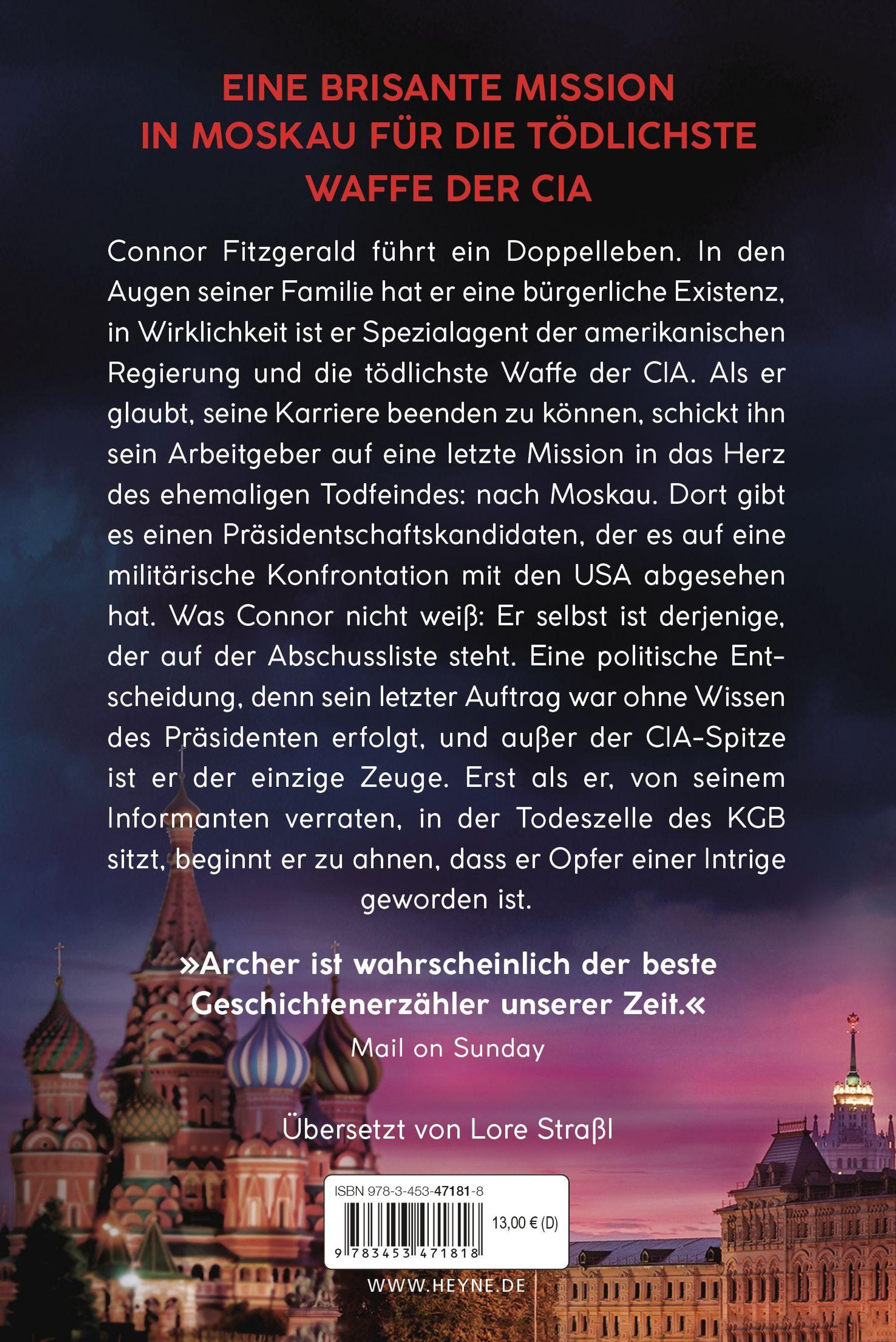 Connor Fitzgerald führt ein Doppelleben. In den Augen seiner Familie hat er eine bürgerliche Existenz, in Wirklichkeit ist er Spezialagent der amerikanischen Regierung und die tödlichste Waffe der CIA. Als er glaubt, seine Karriere beenden zu können, schickt ihn sein Arbeitgeber auf eine letzte Mission in das Herz des ehemaligen Todfeindes: nach Moskau. Dort gibt es einen Präsidentschaftskandidaten, der es auf eine militärische Konfrontation mit den USA abgesehen hat. Was Connor nicht weiß: Er selbst ist derjenige, der auf der Abschussliste steht. Eine politische Entscheidung, denn sein letzter Auftrag war ohne Wissen des Präsidenten erfolgt, und außer der CIA-Spitze ist er der einzige Zeuge. Erst als er, von seinem Informanten verraten, in der Todeszelle des KGB sitzt, beginnt er zu ahnen, dass er Opfer einer Intrige geworden ist.