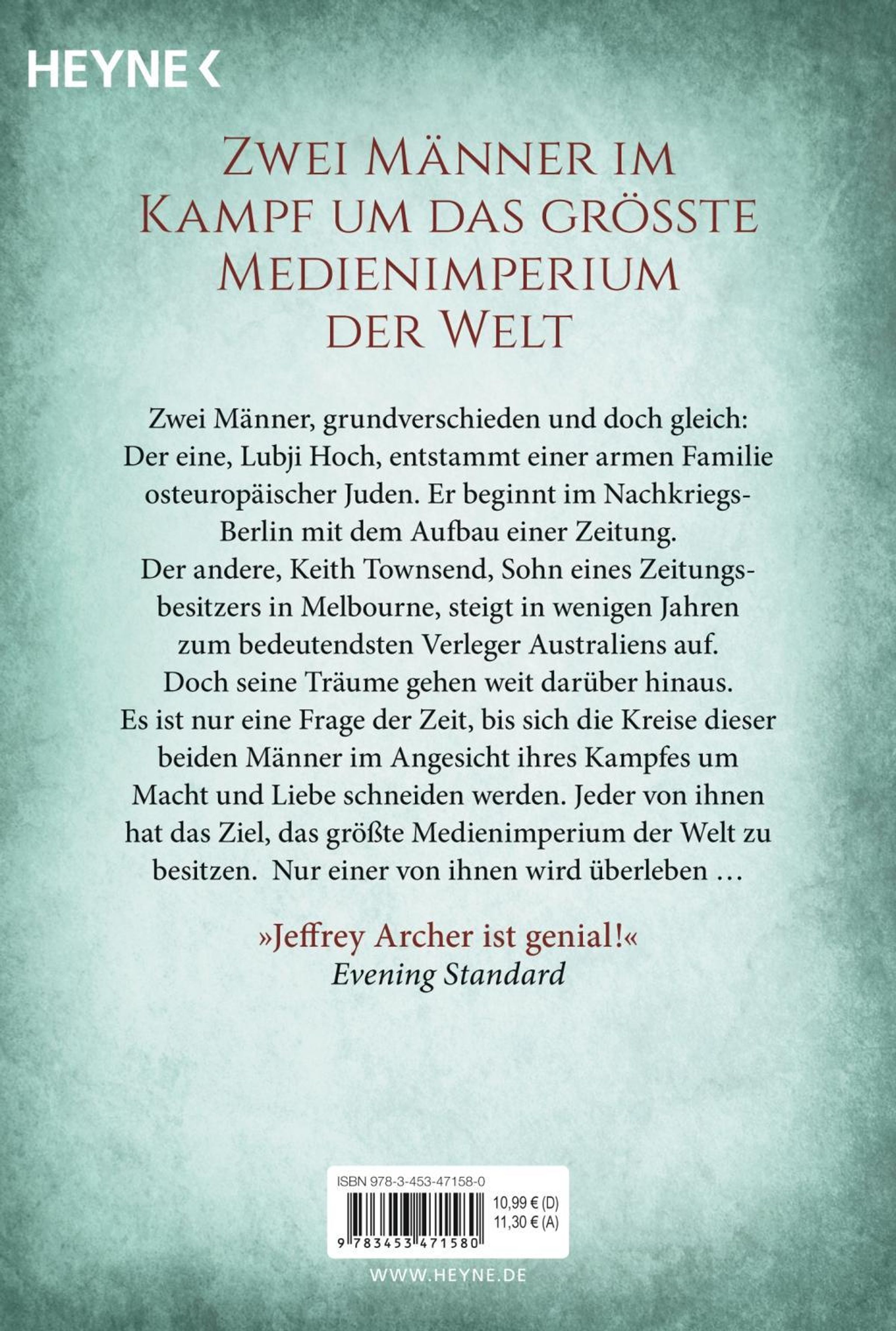 Jeffrey Archer, geb. 1940 in London, wurde bereits mit 29 Jahren Abgeordneter im britischen Unterhaus. Hoch verschuldet musste er zurücktreten und schrieb den ersten seiner vielen internationalen Bestseller. 1992 wurde er in den Adelsstand erhoben, gehörte lange dem Oberhaus an und verbüßte eine zweijährige Haftstrafe wegen Meineids. Heute lebt er in London und Cambridge. Er ist verheiratet und hat zwei Söhne.Anmerkungen:
