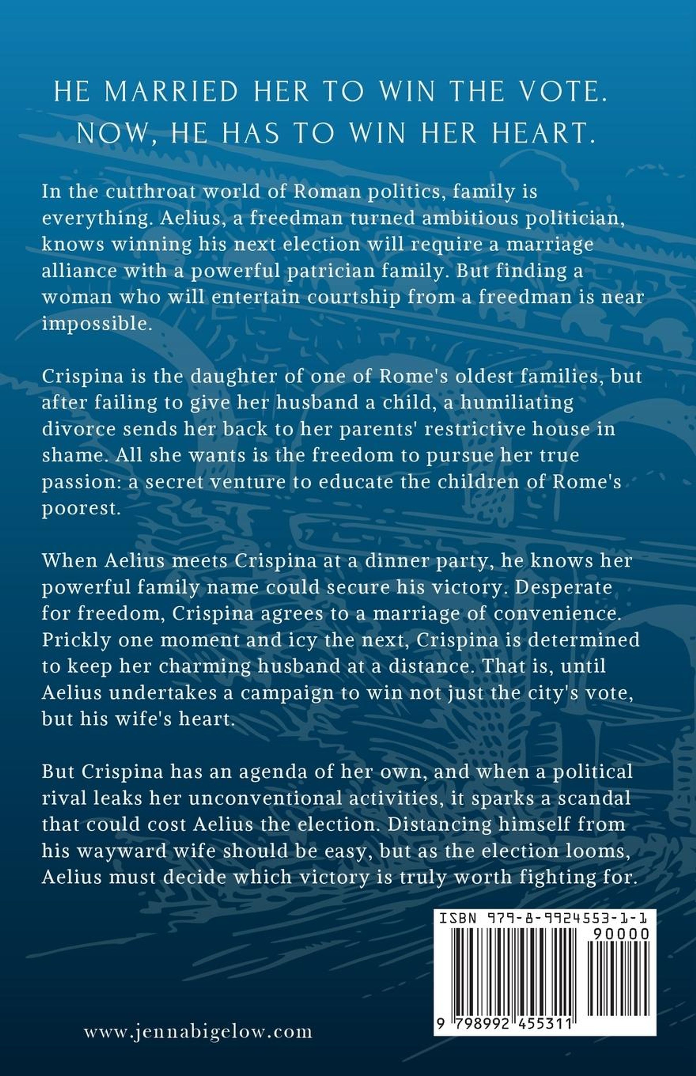 When Aelius meets Crispina at a dinner party, he knows her powerful family name could secure his victory. Desperate for freedom, Crispina agrees to a marriage of convenience. Prickly one moment and icy the next, Crispina is determined to keep her charming husband at a distance. That is, until Aelius undertakes a campaign to win not just the city's vote, but his wife's heart.