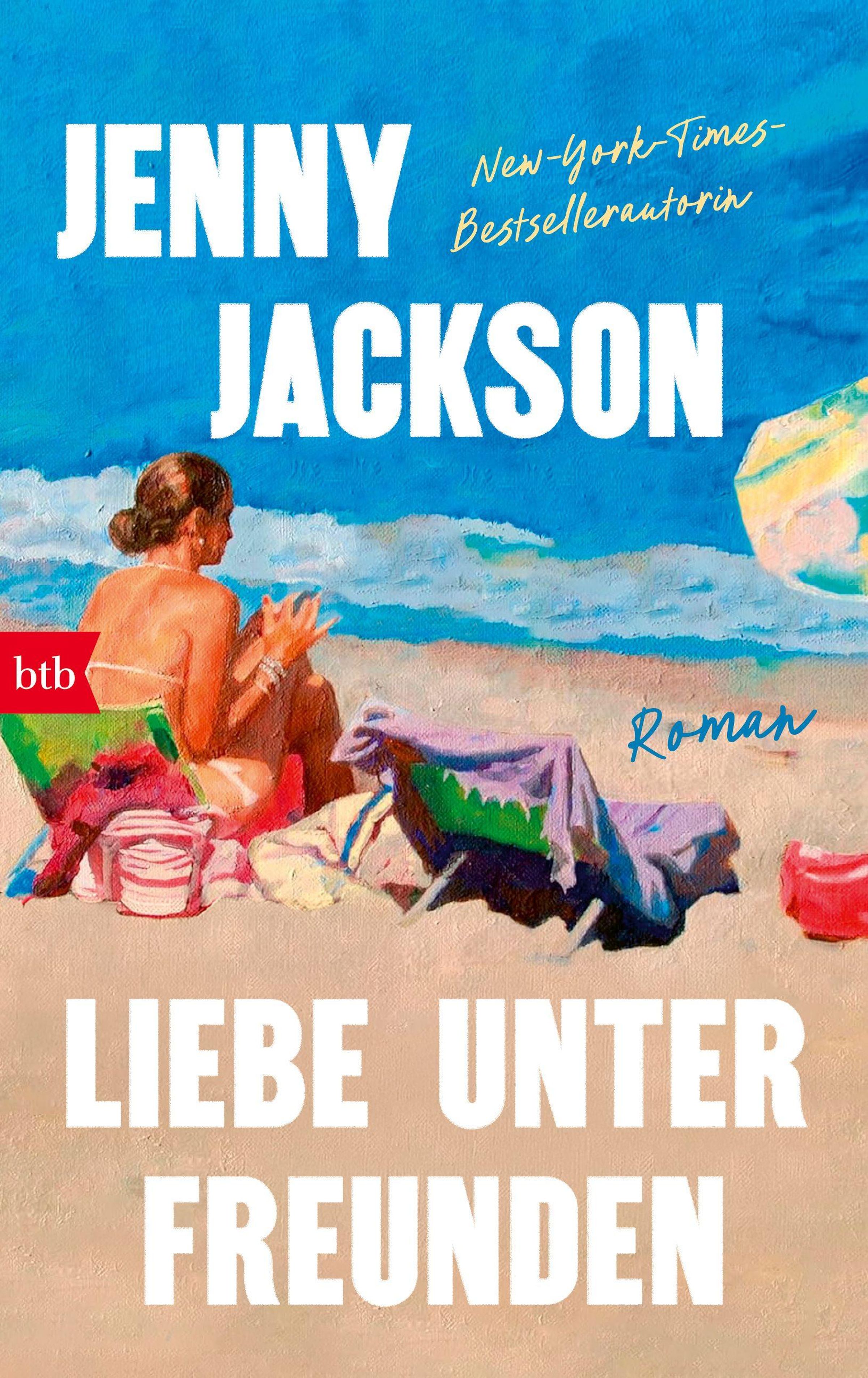 „JENNY JACKSON, New-York-Times-Bestsellerautorin, LIEBE UNTER FREUNDEN“. Illustration: Frau am Strand, btb-Logo., Buch