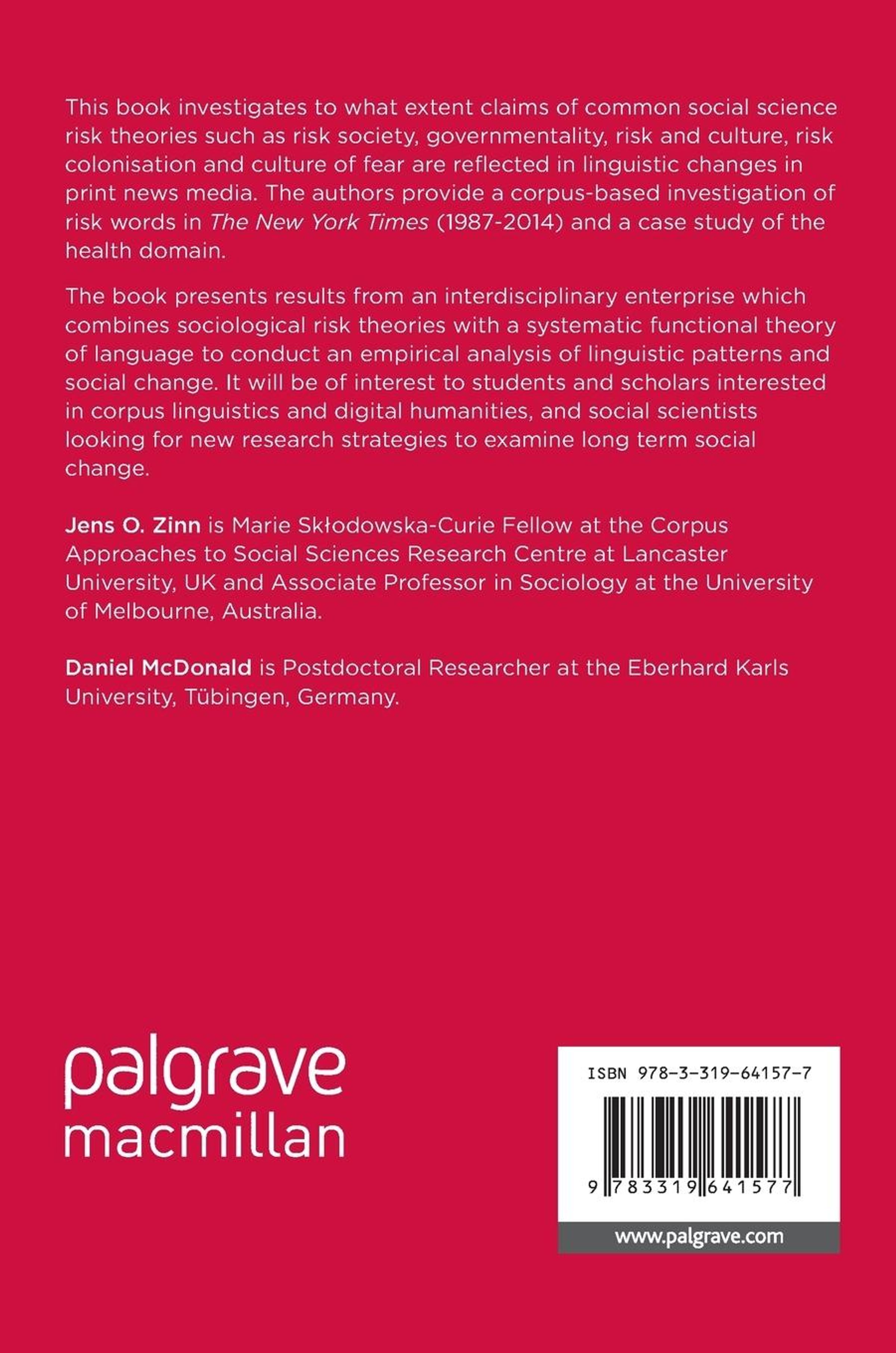 This book investigates to what extent claims of common social science risk theories such as risk society, governmentality, risk and culture, risk colonisation and culture of fear are reflected in linguistic changes in print news media. The authors provide a corpus-based investigation of risk words in The New York Times (1987-2014) and a case study of the health domain. The book presents results from an interdisciplinary enterprise which combines sociological risk theories with a systematic functional theory of language to conduct an empirical analysis of linguistic patterns and social change. It will be of interest to students and scholars interested in corpus linguistics and digital humanities, and social scientists looking for new research strategies to examine long term social change.