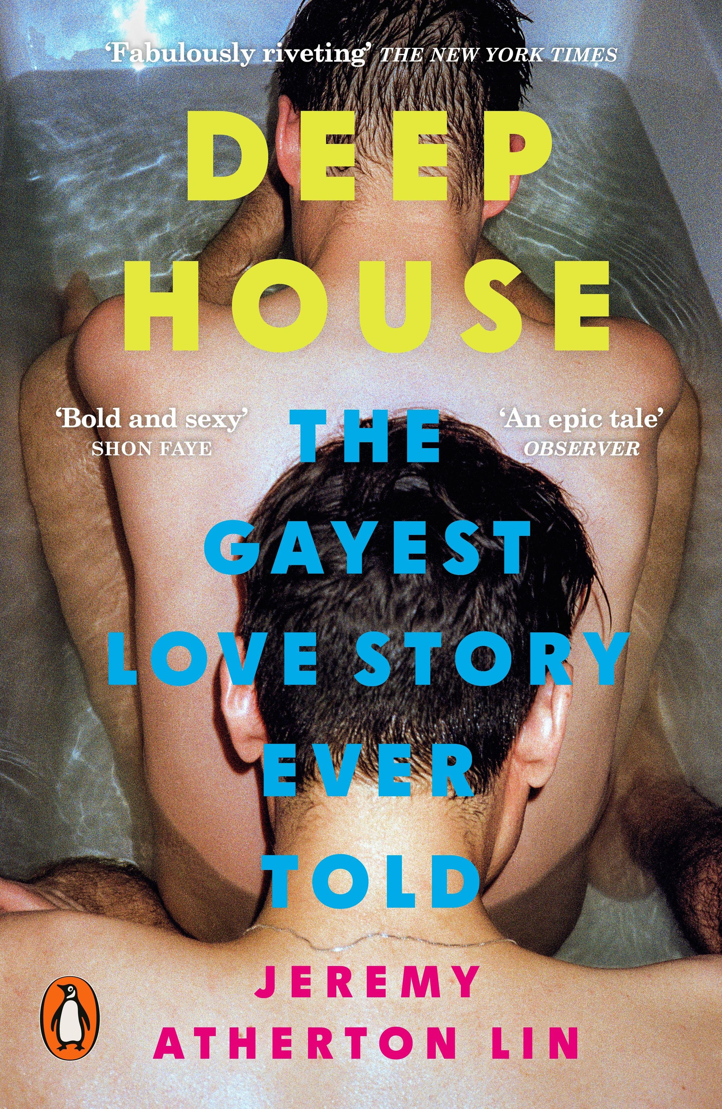"DEEP HOUSE. THE GAYEST LOVE STORY EVER TOLD. JEREMY ATHERTON LIN." Zwei Männer in Badewanne, Rückenansicht, Penguin-Logo., Buch