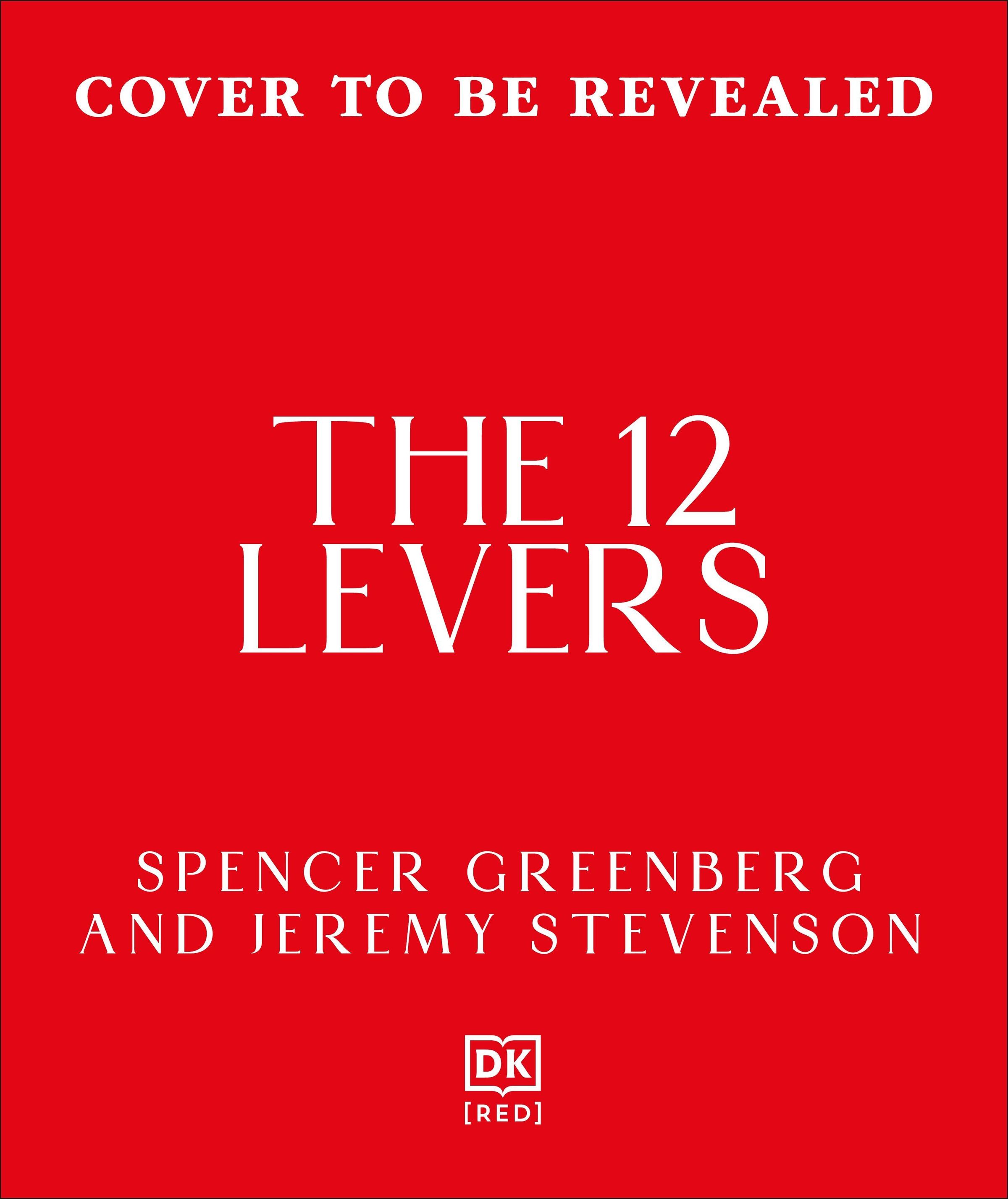 "COVER TO BE REVEALED. THE 12 LEVERS. SPENCER GREENBERG AND JEREMY STEVENSON." Roter Hintergrund, zentrierter weißer Text., Buch