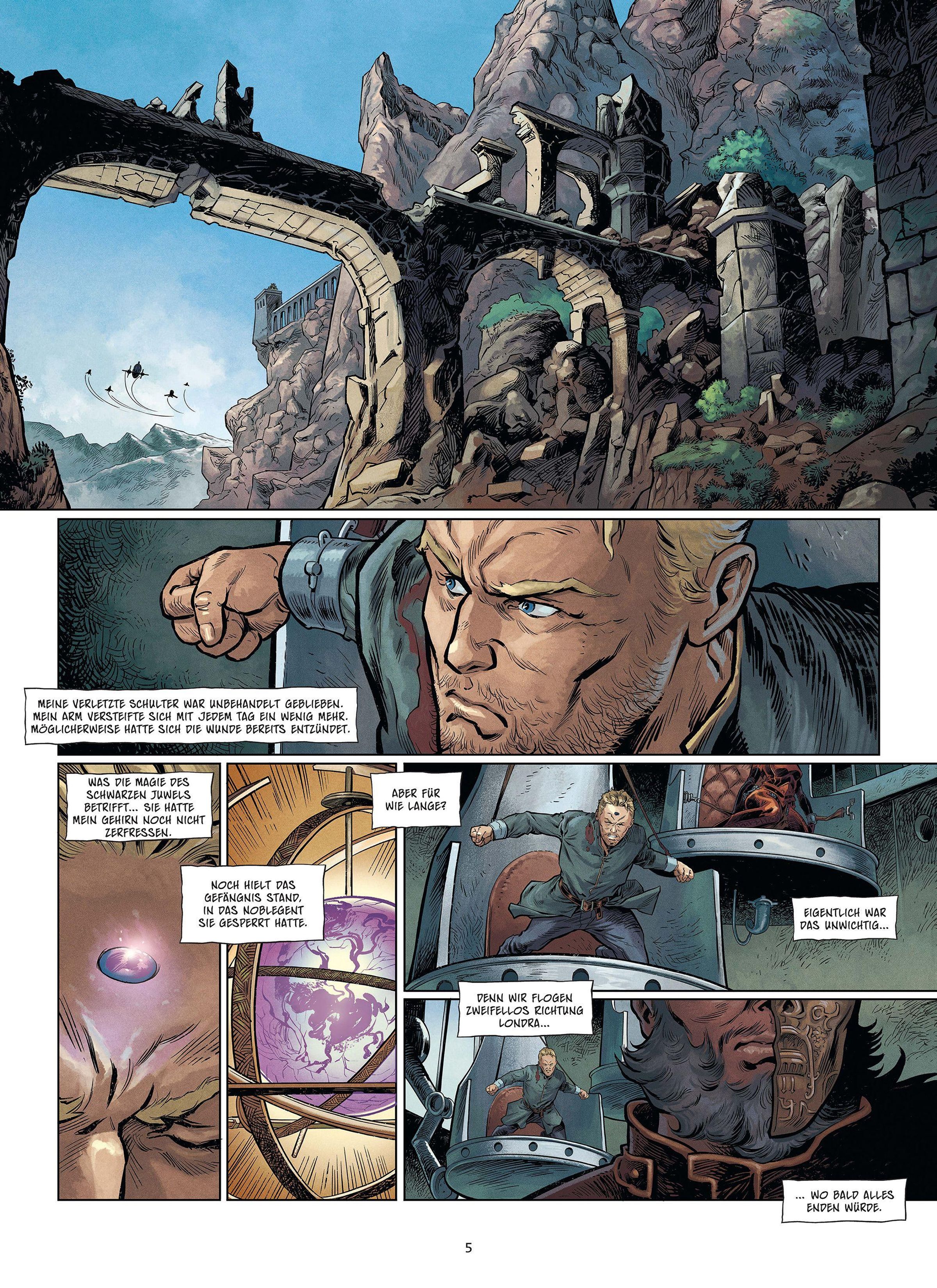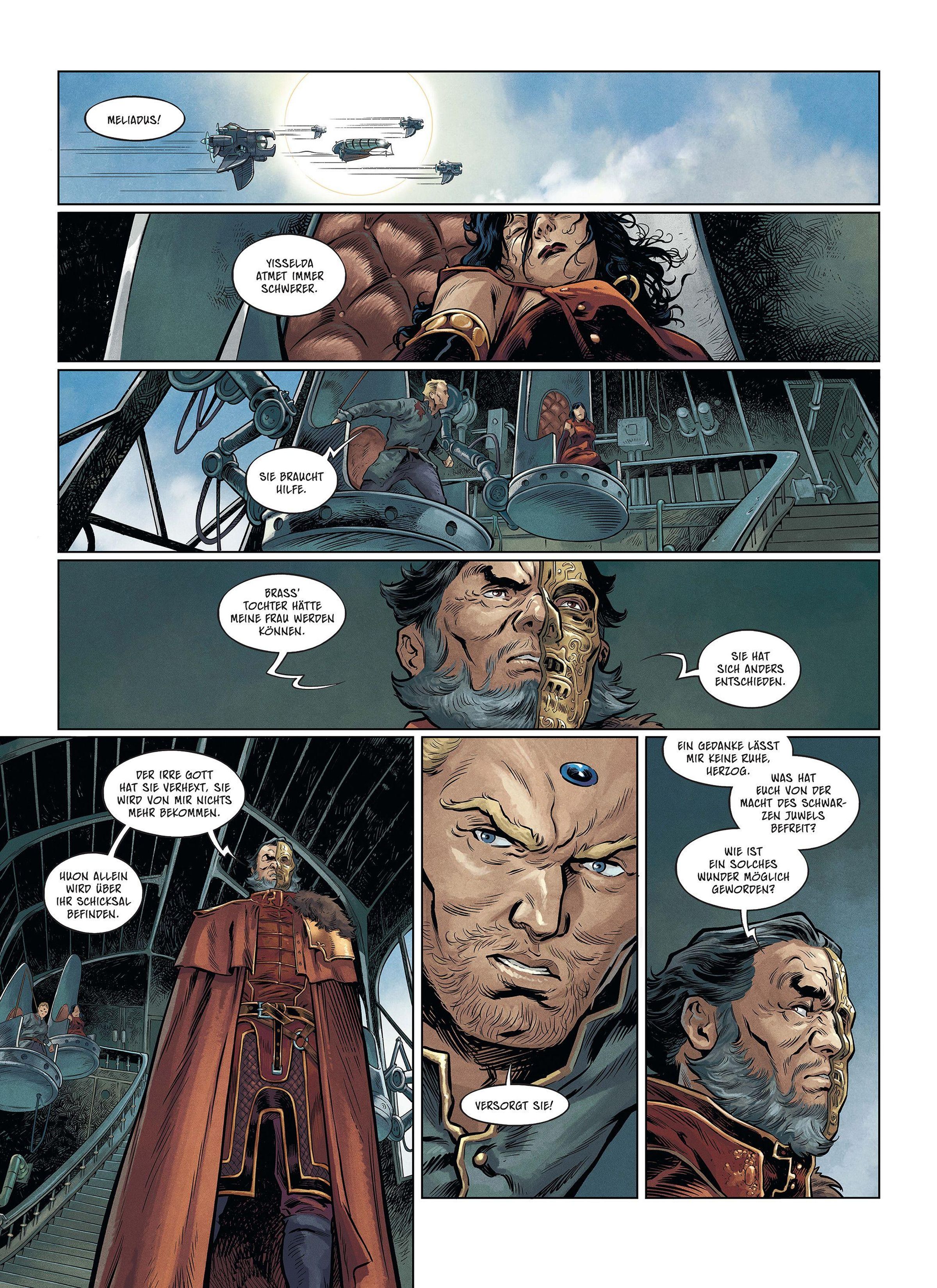 Der Herzog von Köln ist Gefangener der Granbretanier, und sein Zustand ist bedrohlich. Auch wenn das schwarze Juwel auf seiner Stirn seinen Geist noch nicht völlig verschlungen hat, ist er dennoch schwer verwundet und muss das Leid seiner Kameraden mit ansehen. Bei Tagesanbruch wird das freie Herzogtum Kamarg von den Streitkräften des Imperiums dem Erdboden gleichgemacht werden! Als alles verloren scheint, verhilft ein unerwarteter Verbündeter Hawkmoon zur Flucht. Und da erinnert er sich an den Heliogon: eine mystische Sphäre, die, wenn sie sich lange genug am höchsten Punkt der Stadt aufladen kann, die Macht der Elemente entfesselt. Es ist die letzte Chance, Kamarg zu retten. Aber sie wird mit Blut erkauft werden müssen.