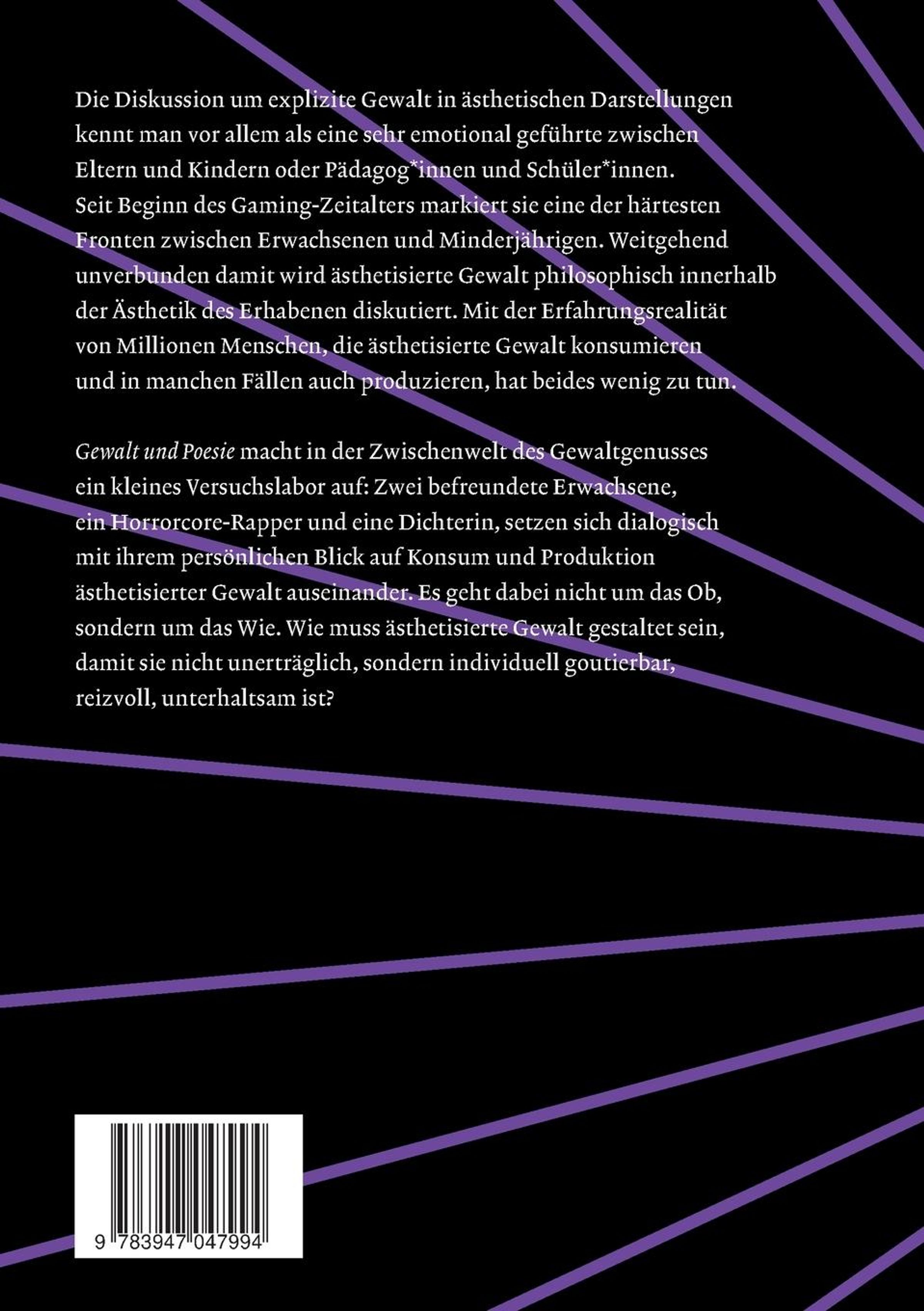 Die Diskussion um explizite Gewalt in ästhetischen Darstellungen kennt man vor allem als eine sehr emotional geführte zwischen Eltern und Kindern oder Pädagog*innen und Schüler*innen. Seit Beginn des Gaming-Zeitalters markiert sie eine der härtesten Fronten zwischen Erwachsenen und Minderjährigen. Weitgehend unverbunden damit wird künstlerisch dargestellte Gewalt philosophisch innerhalb der Ästhetik des Erhabenen diskutiert. Mit der Erfahrungsrealität von Millionen Menschen, die ästhetisierte Gewalt konsumieren und in manchen Fällen auch produzieren, hat beides wenig zu tun. >>Gewalt und Poesie<< macht in der Zwischenwelt des Gewaltgenusses ein kleines Versuchslabor auf: Zwei befreundete Erwachsene, ein Horrorcore-Rapper und eine Dichterin, setzen sich dialogisch mit ihrem persönlichen Blick auf Konsum und Produktion ästhetisierter Gewalt auseinander. Es geht dabei nicht um das ob, sondern um das wie. Wie muss ästhetisierte Gewalt gestaltet sein, damit sie nicht unerträglich, sondern individuell goutierbar, reizvoll, unterhaltsam ist?