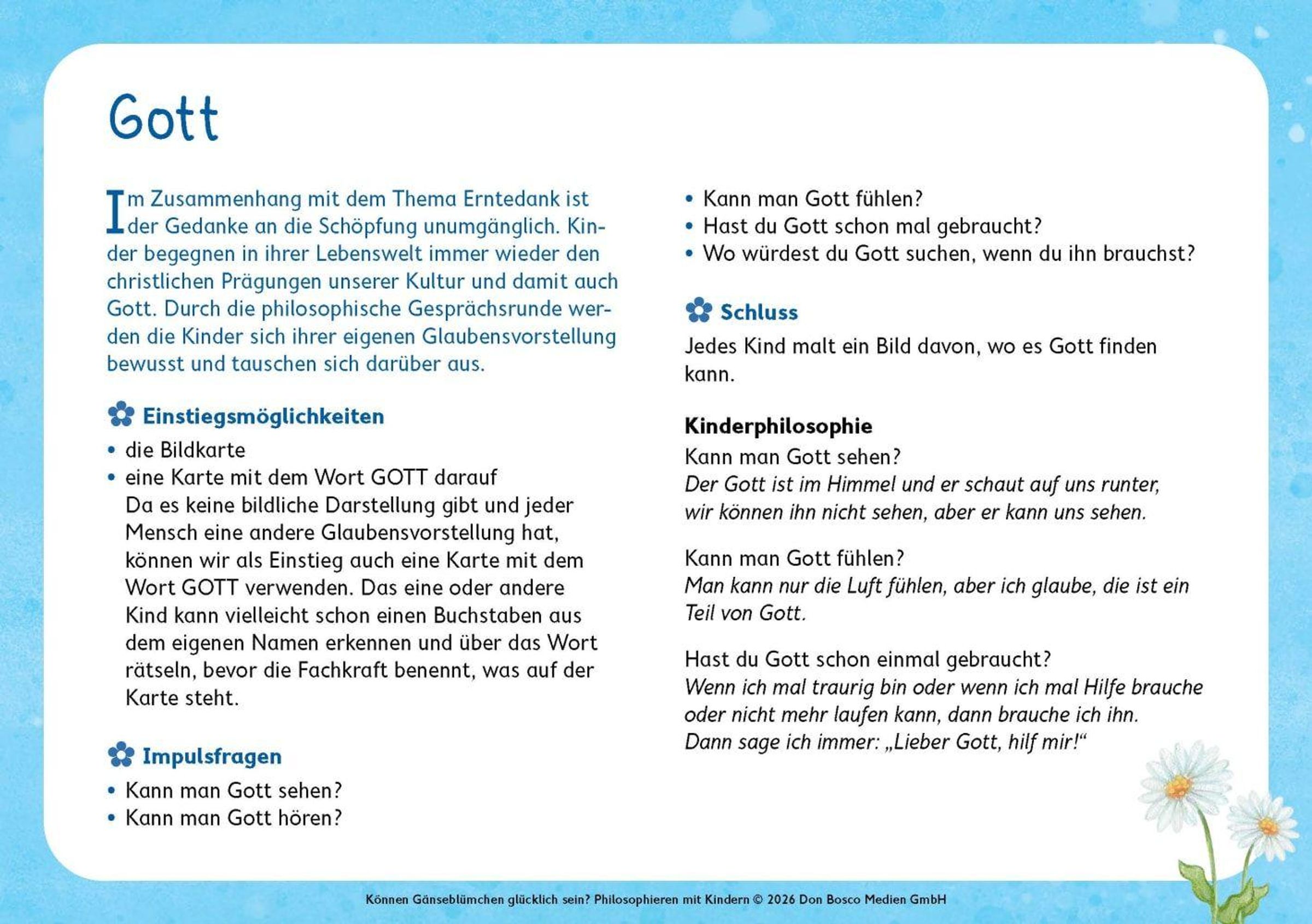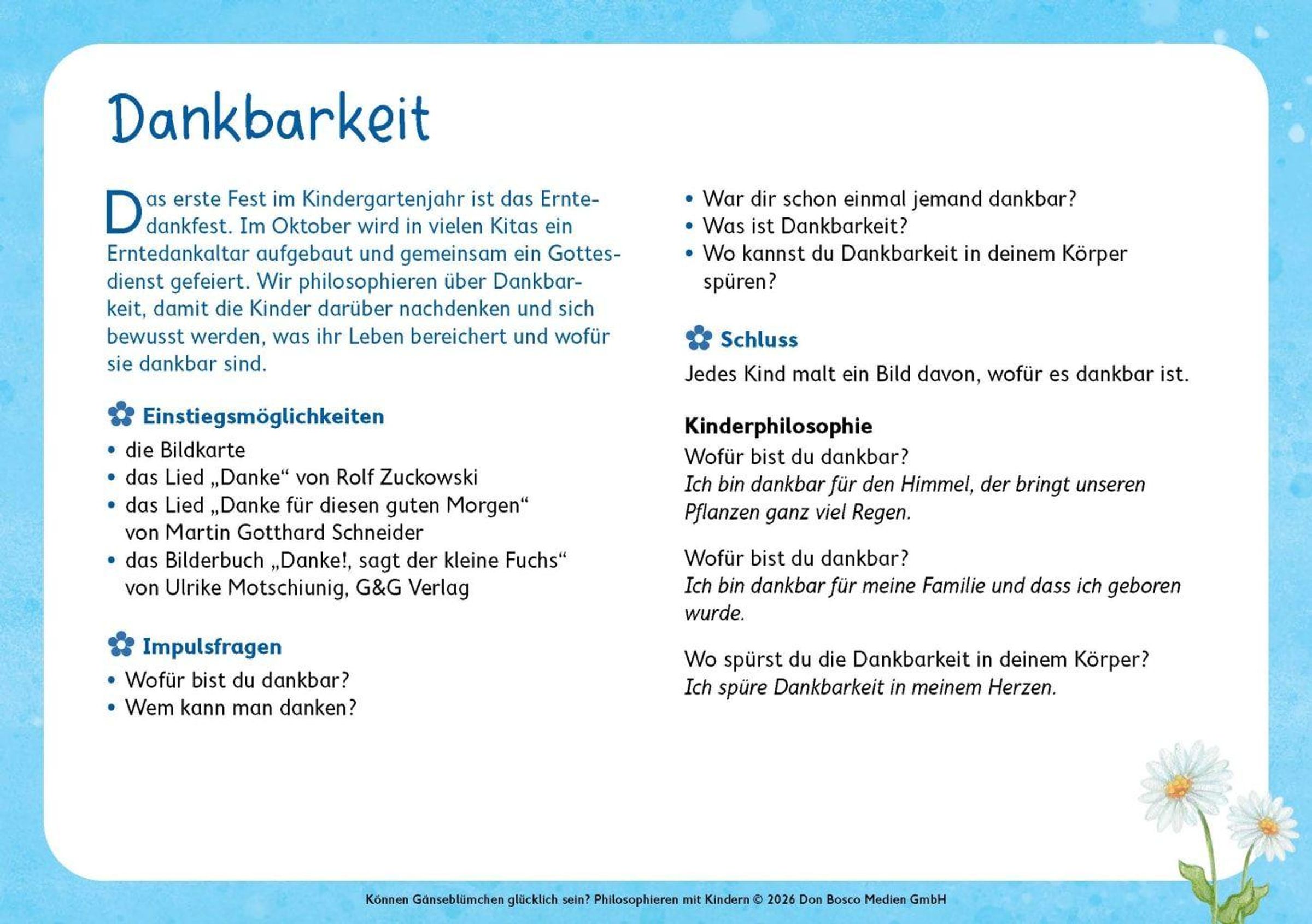 Ausgehend von den Impulsfragen auf den Bildkarten ergeben sich Gespräche rund um Themen wie Dankbarkeit, Glück, Wünsche, Natur oder Angst, zu denen jedes Kind einen eigenen Bezug hat. Die unterschiedlichen Antworten und Lösungen führen zu weiteren philosophischen Fragen - das fördert Kommunikationsfähigkeit und Diskussionskultur! Und wenn die ganze Gruppe gemeinsam nachdenkt, findet sie vielleicht auch eine befriedigende Antwort auf die Frage, ob Gänseblümchen glücklich sein können.