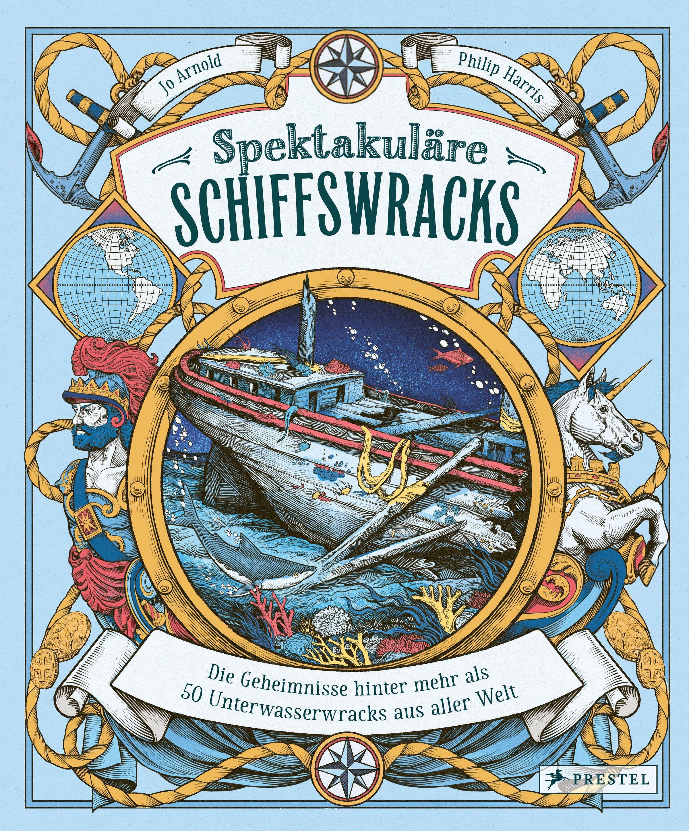 "Spektakuläre Schiffswracks" von Jo Arnold und Philip Harris. Illustration eines Schiffswracks umrandet von nautischen Motiven., Buch