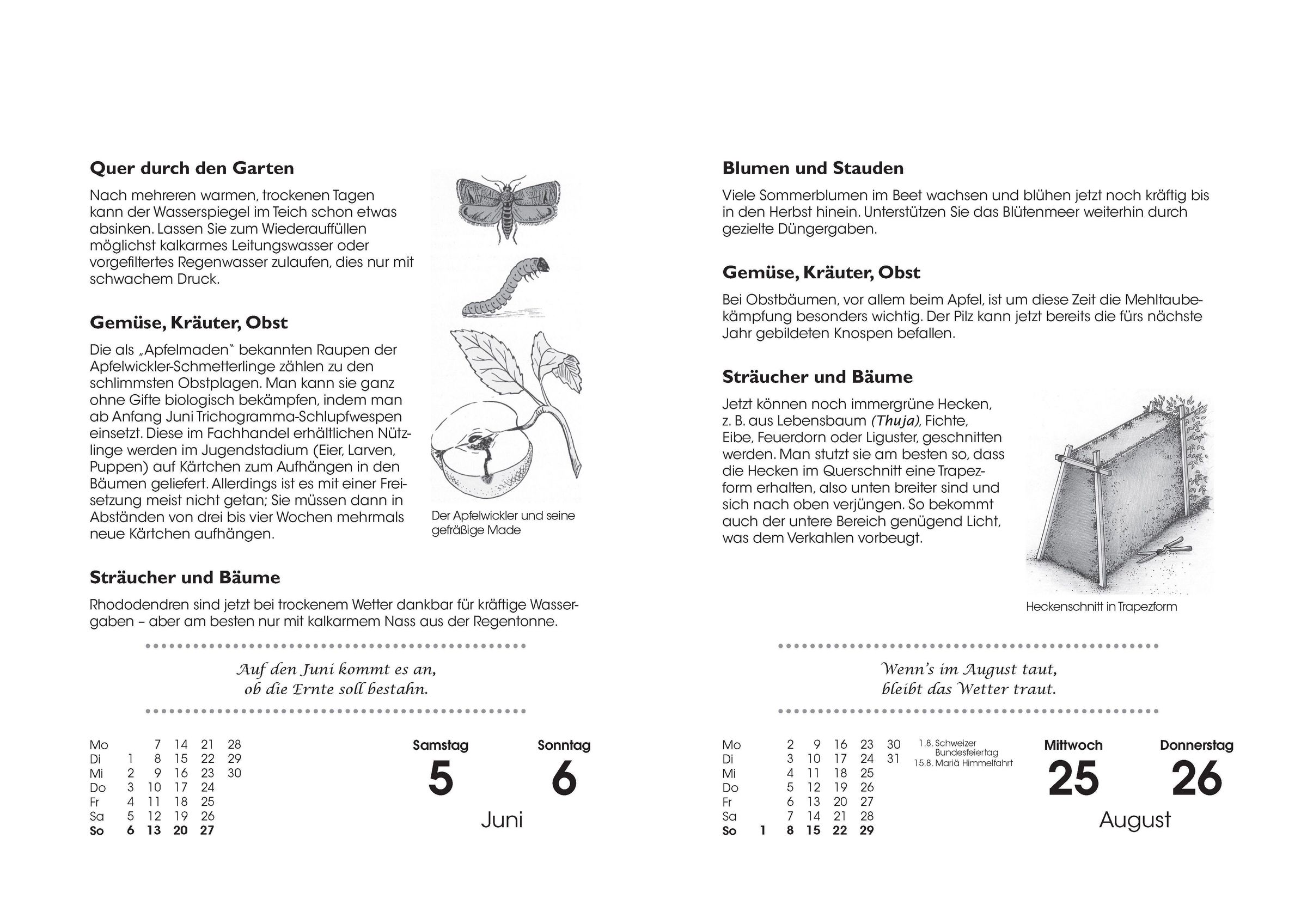 Mit dem Gartenkalender kann man sicher sein, dass in Haus und Garten das ganze Jahr über alles prächtig gedeiht. Bewährte Tipps erleichtern die Gartenarbeit und helfen, Stauden, Gehölze und Nutzpflanzen bestens zu versorgen. Der Kalender führt nicht nur zuverlässig durch die Pflanzsaison, sondern auch durch Herbst und Winter, wenn es gilt, die Pflanzen winterfest zu machen und das nächste Gartenjahr vorzubereiten.