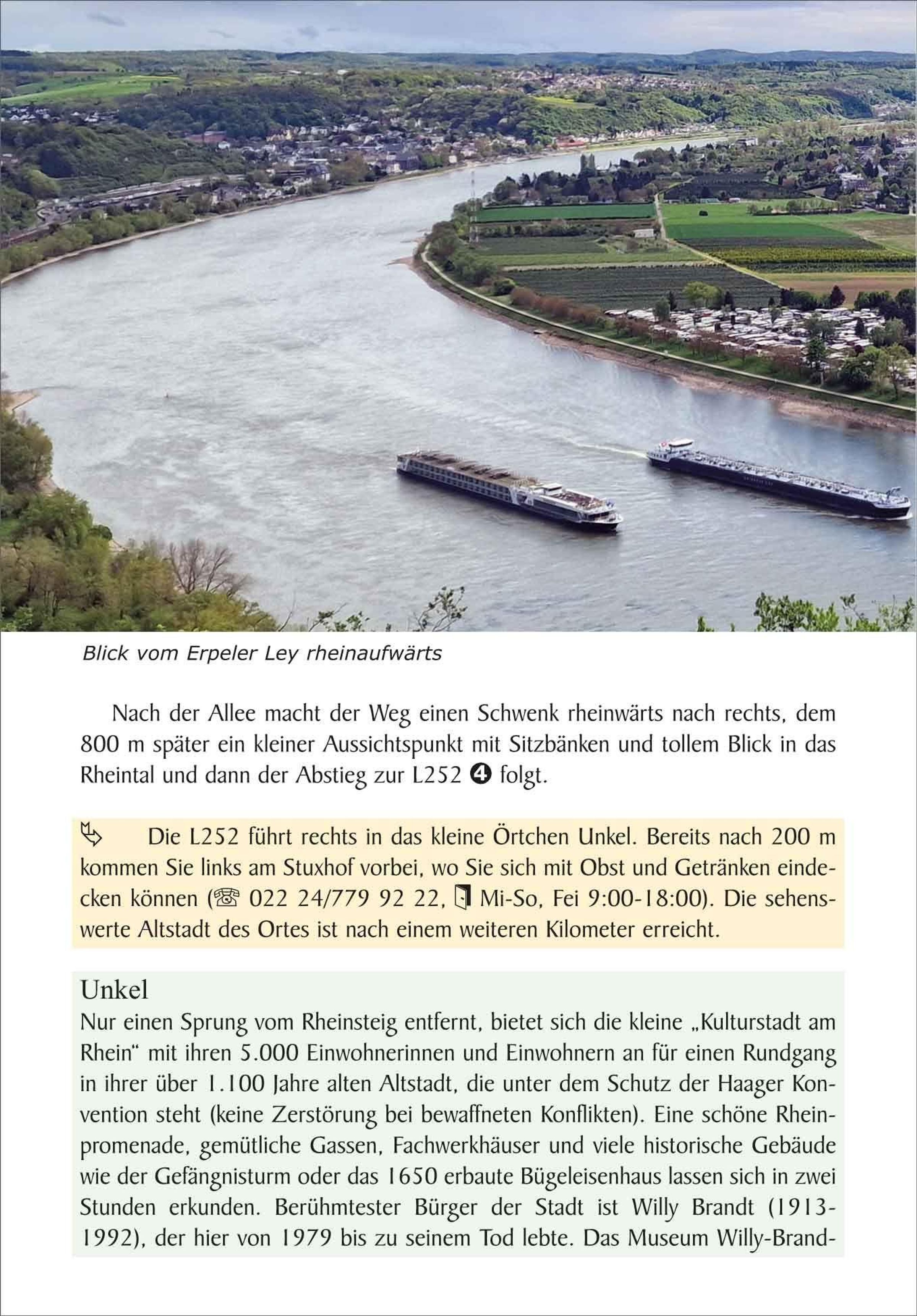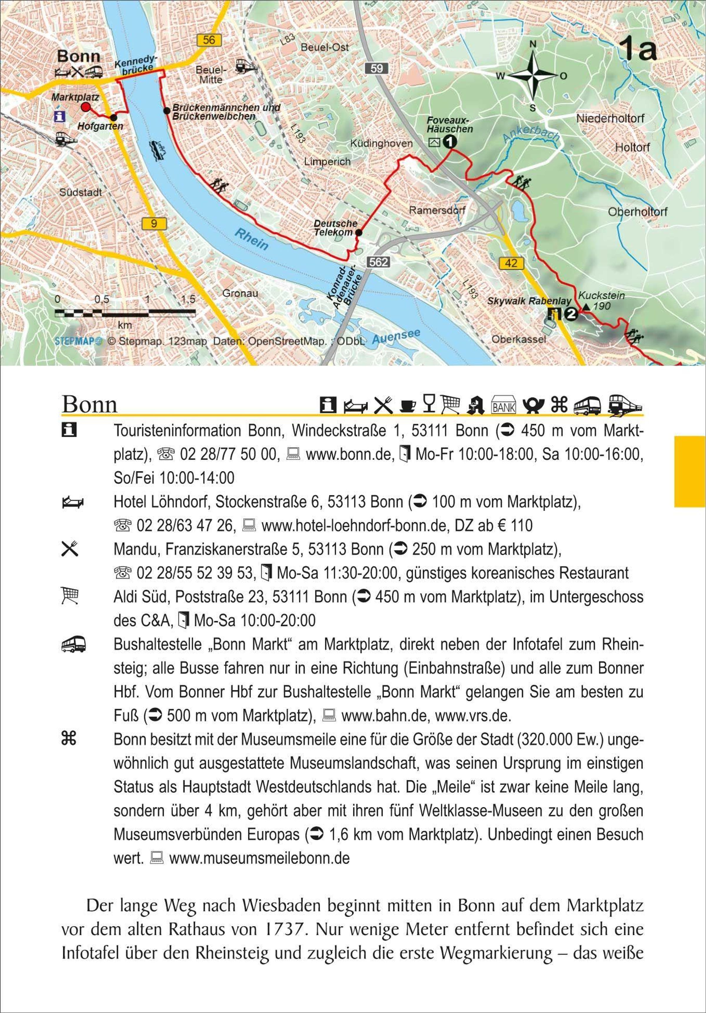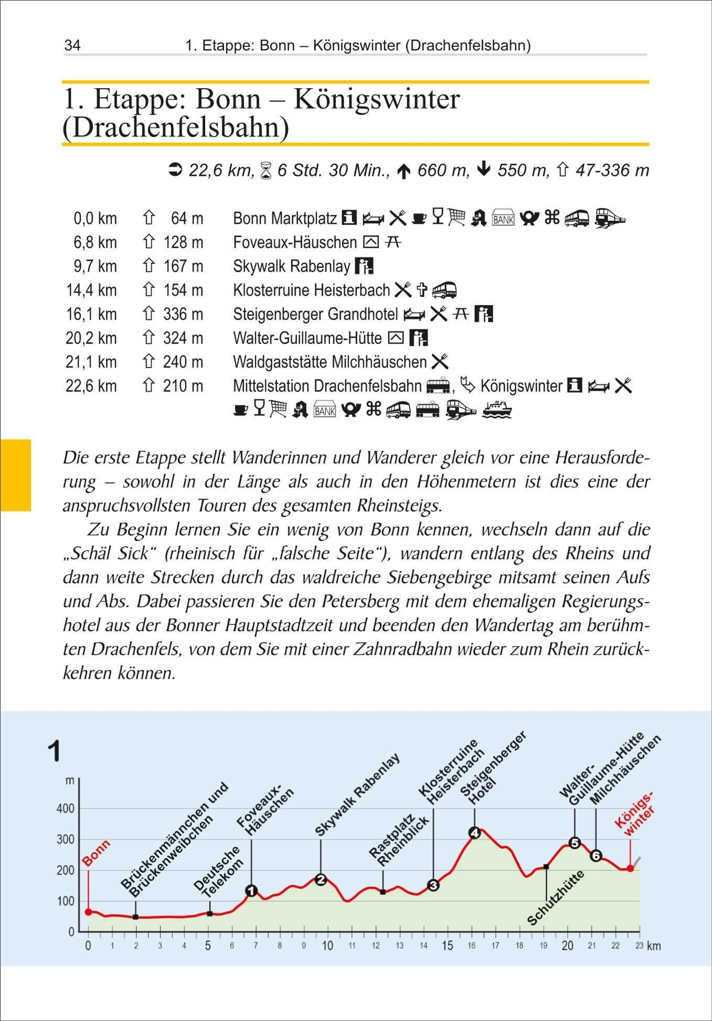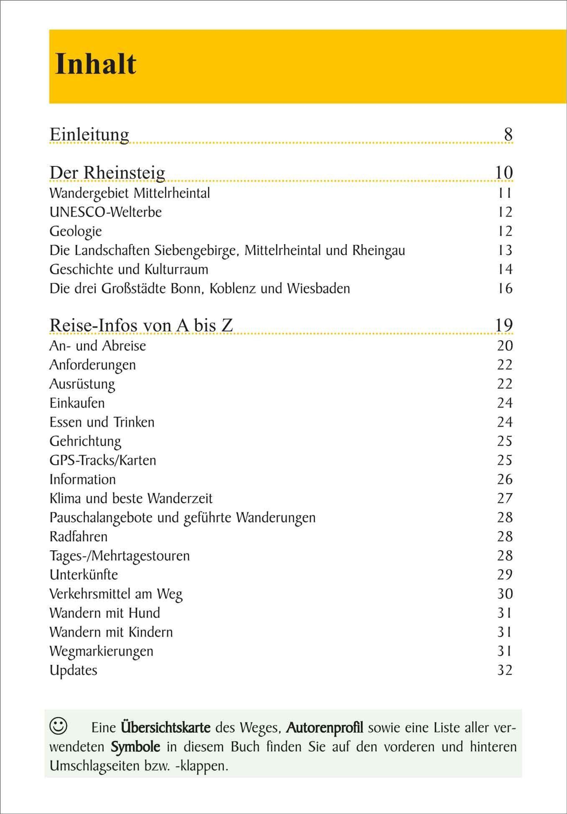 Von Bonn bis Wiesbaden verläuft der Rheinsteig auf der rechten Rheinseite und durchquert dabei auf seinen 320 km neben Siebengebirge und Rheingau das gesamte UNESCO-Welterbe Oberes Mittelrheintal. Auf 20 Etappen erschließen sich die beeindruckenden Felsformationen des Rheintals, pittoreske Städtchen, steile Weinberge, mittelalterliche Klöster und einst mächtige Burgen und Schlösser.