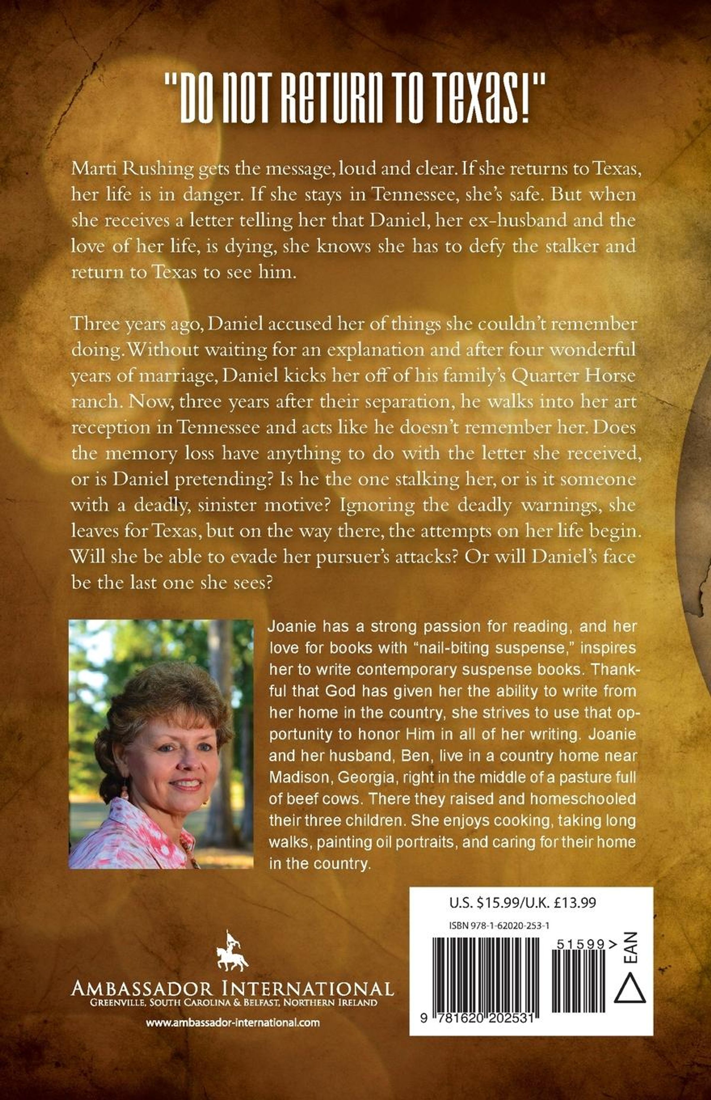 "Do Not Return To Texas!" Marti Rushing gets the message, loud and clear. If she returns to Texas, her life is in danger. If she stays in Tennessee, she's safe. But when she receives a letter telling her that Daniel, her ex-husband and the love of her life, is dying, she knows she has to defy the stalker and return to Texas to see him. Three years ago, Daniel accused her of things she couldn't remember doing. Without waiting for an explanation and after four wonderful years of marriage, Daniel kicked her off of his family's Quarter Horse ranch. Now, three years after their separation, he walks into her art reception in Tennessee and acts like he doesn't remember her. Does the memory loss have anything to do with the letter she received, or is Daniel pretending? Is he the one stalking her, or is it someone with a deadly, sinister motive? Ignoring the deadly warnings, she leaves for Texas, but on the way there, the attempts on her life begin. Will she be able to evade her pursuer's attacks? Or will Daniel's face be the last one she sees?