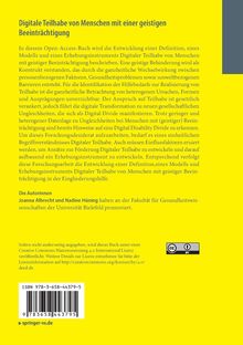 In diesem Open-Access-Buch wird die Entwicklung einer Definition, eines Modells und eines Erhebungsinstruments Digitaler Teilhabe von Menschen mit geistiger Beeinträchtigung beschrieben. Eine geistige Behinderung wird als Konstrukt verstanden, das durch die ganzheitliche Wechselwirkung zwischen personenbezogenen Faktoren, Gesundheitsproblemen sowie umweltbezogenen Barrieren entsteht. Für die Identifikation der Hilfebedarfe zur Realisierung von Teilhabe ist die ganzheitliche Betrachtung von heterogenen Ursachen, Formen und Ausprägungen unverzichtbar. Der Anspruch auf Teilhabe ist gesetzlich verankert, jedoch führt die digitale Transformation zu neuen gesellschaftlichen Ungleichheiten, die sich als Digital Divide manifestieren. Trotz geringer und heterogener Datenlage zu Ungleichheiten bei Menschen mit (geistiger) Beeinträchtigung sind bereits Hinweise auf eine Digital Disability Divide zu erkennen. Um dieses Forschungsdesiderat aufzuarbeiten, bedarf es eines einheitlichen Begriffsverständnisses Digitaler Teilhabe. Auch müssen Einflussfaktoren eruiert werden, um Ansätze zur Förderung Digitaler Teilhabe zu entwickeln und darauf aufbauend ein Erhebungsinstrument zu entwickeln. Entsprechend verfolgt diese Forschungsarbeit die Entwicklung einer Definition, eines Modells und Erhebungsinstruments Digitaler Teilhabe von Menschen mit geistiger Beeinträchtigung in der Eingliederungshilfe.